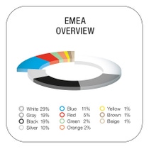 Σε Ευρώπη, Μέση Ανατολή και Αφρική (EMEA) τα δύο δημοφιλέστερα χρώματα – λευκό και μαύρο – παρουσίασαν αύξηση, ενώ το γκρι και το ασημί παρουσίασαν απώλειες. Την ίδια στιγμή, ολόκληρη η περιοχή ΕΜΕΑ έγινε ακόμη πιο πολύχρωμη.