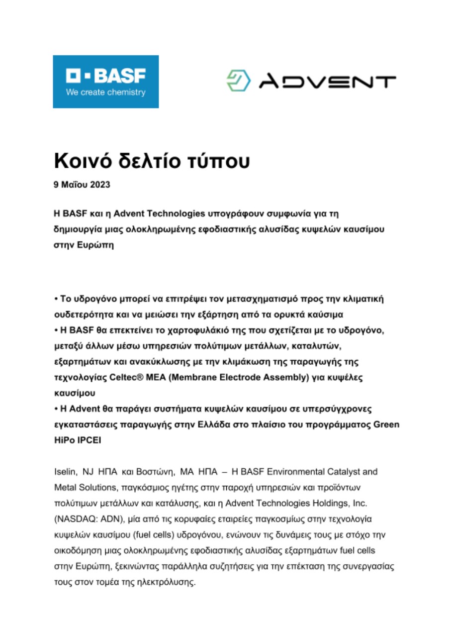 Η BASF και η Advent Technologies υπογράφουν συμφωνία για τη δημιουργία μιας ολοκληρωμένης εφοδιαστικής αλυσίδας κυψελών καυσίμου στην Ευρώπη