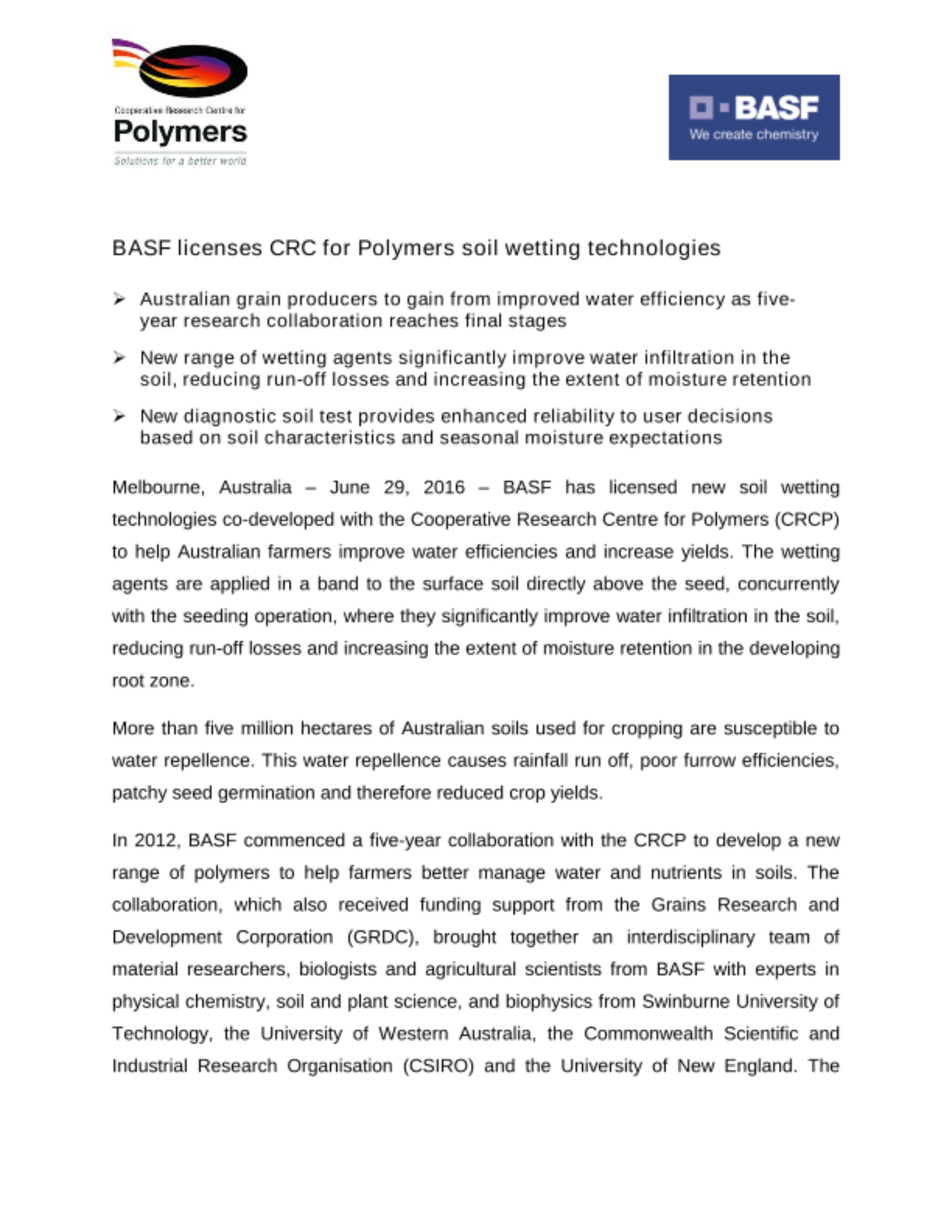 Melbourne, Australia – June 29, 2016 – BASF has licensed new soil wetting technologies co-developed with the Cooperative Research Centre for Polymers (CRCP) to help Australian farmers improve water efficiencies and increase yields. The wetting agents are applied in a band to the surface soil directly above the seed, concurrently with the seeding operation, where they significantly improve water infiltration in the soil, reducing run-off losses and increasing the extent of moisture retention in the developing root zone.