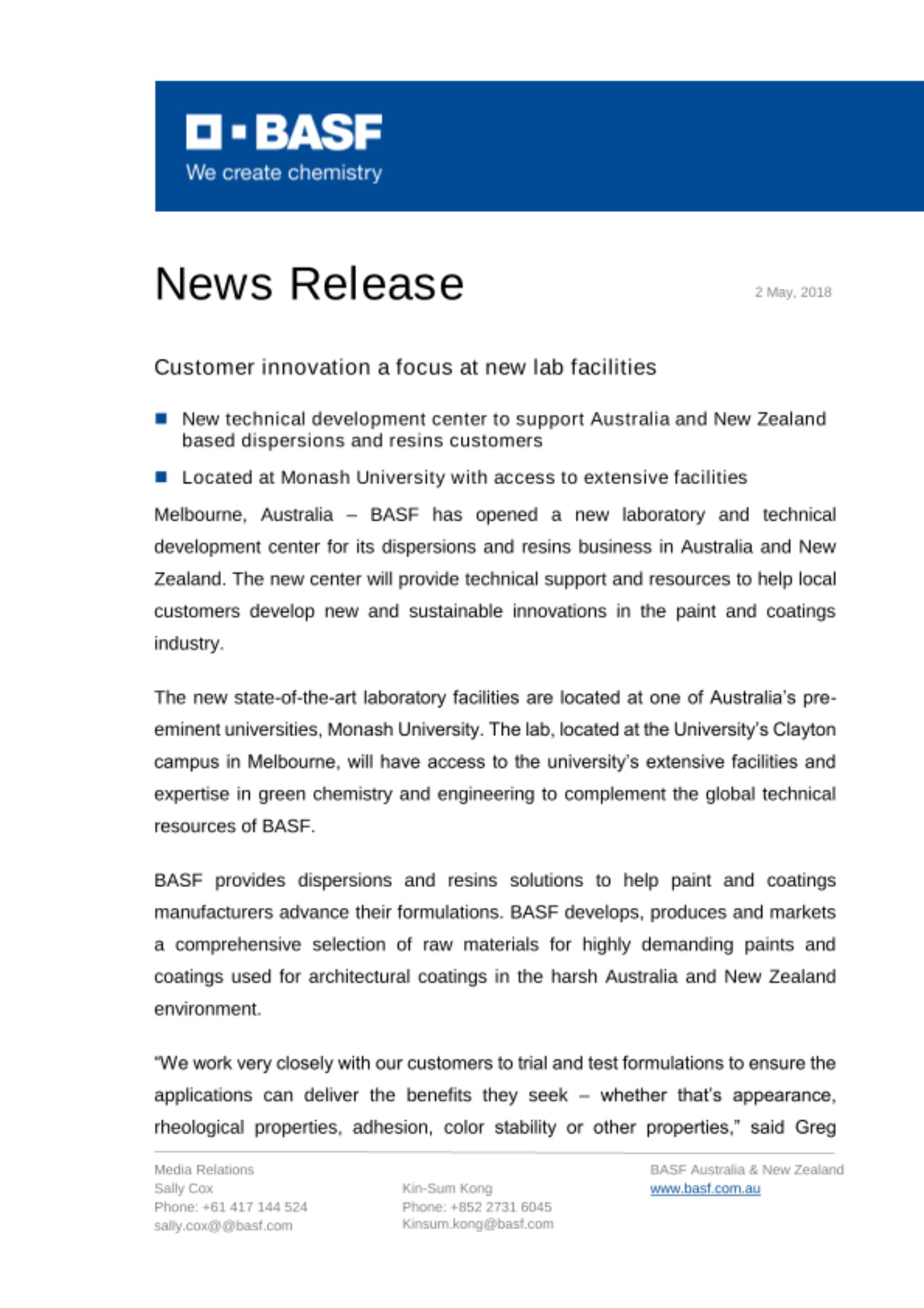“Our laboratory chemists have the capability to support customers across the Australia and New Zealand manufacturing industry leveraging on the broad technical and applications knowledge of the wider BASF team.”