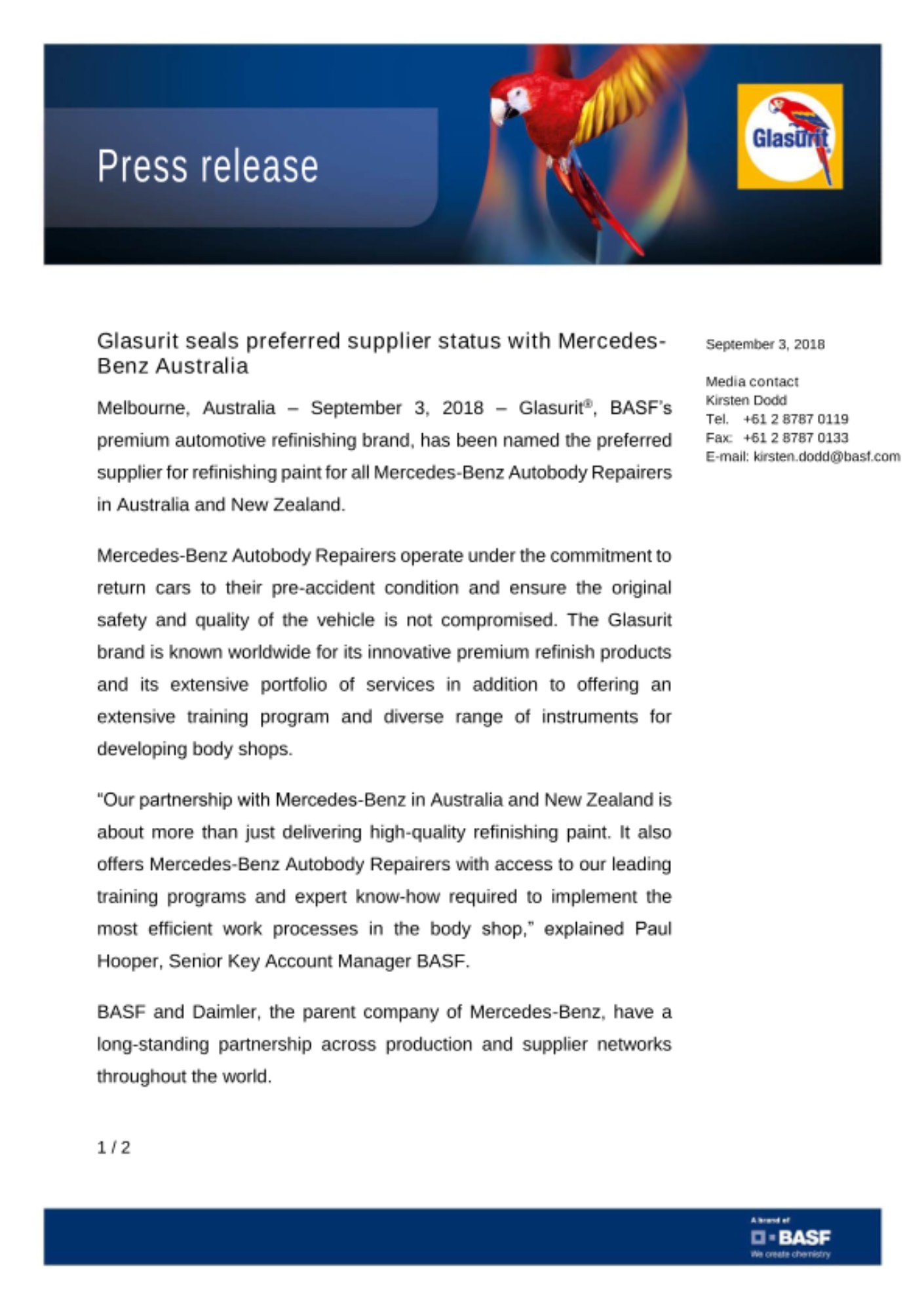 Melbourne, Australia – September 3, 2018 – Glasurit®, BASF’s premium automotive refinishing brand, has been named the preferred supplier for refinishing paint for all Mercedes-Benz Autobody Repairers in Australia and New Zealand.