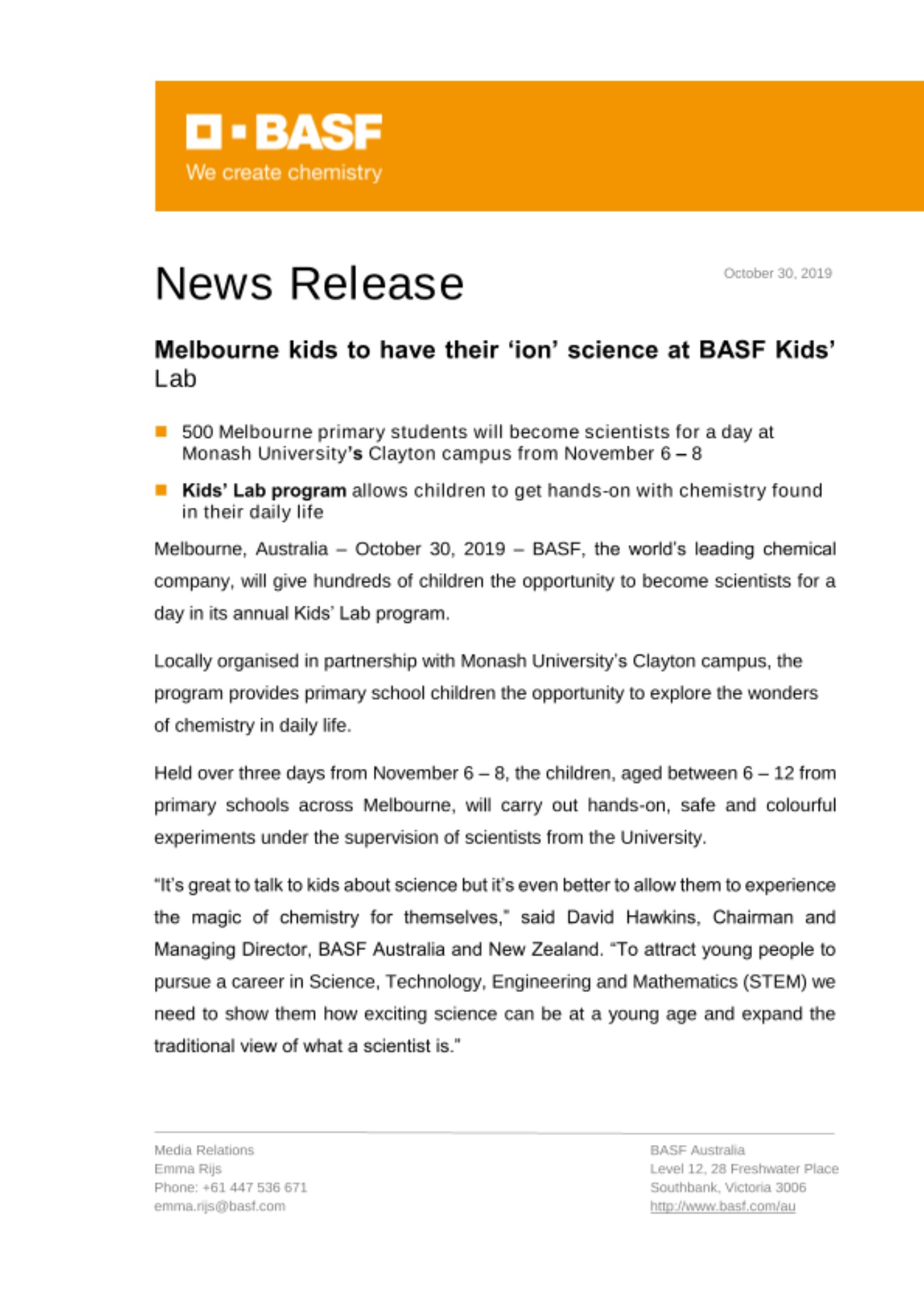 Melbourne, Australia – October 30, 2019 – BASF, the world’s leading chemical company, will give hundreds of children the opportunity to become scientists for a day in its annual Kids’ Lab program.