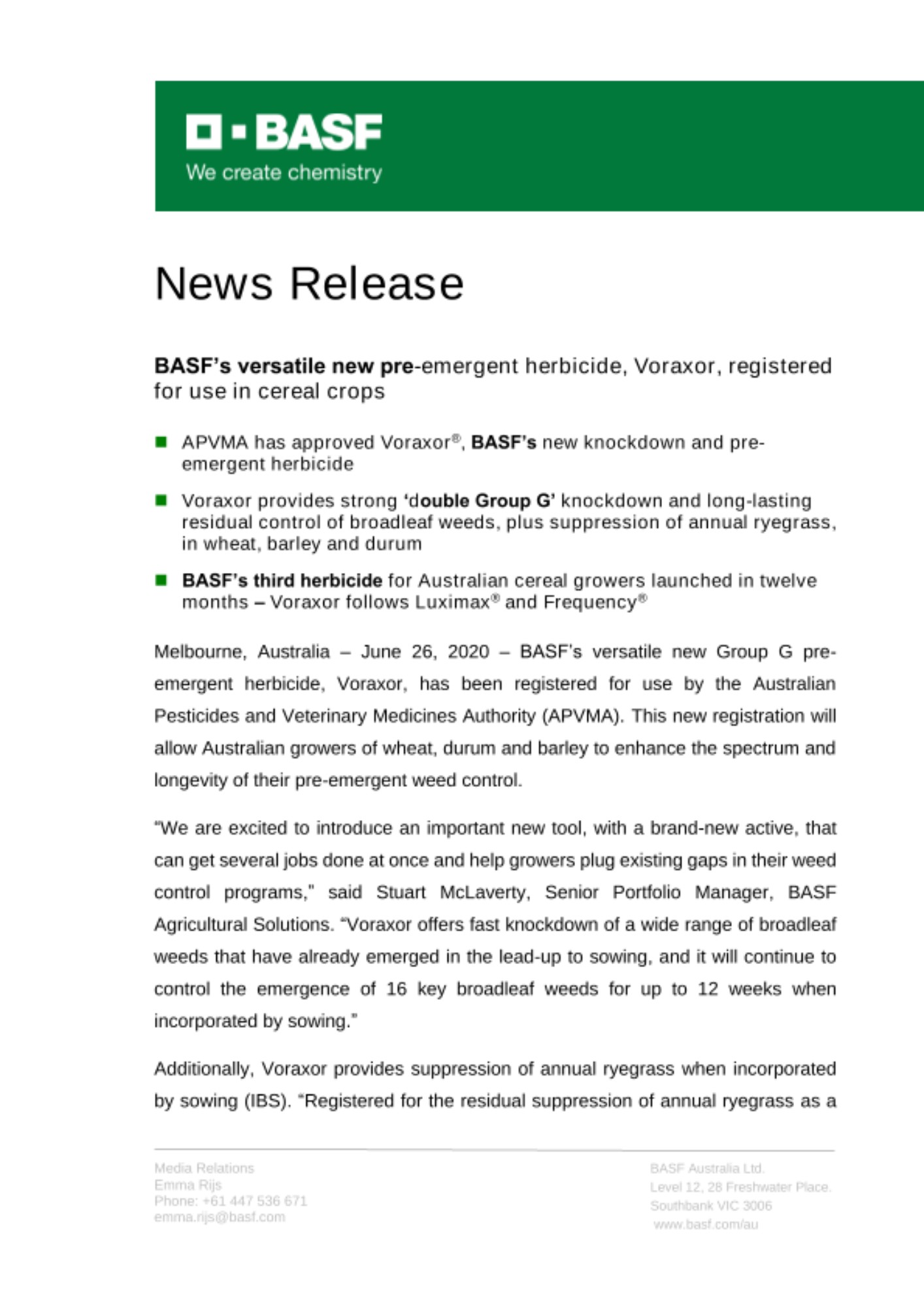 - BASF’s third herbicide for Australian cereal growers launched in twelve months – Voraxor follows Luximax® and Frequency®