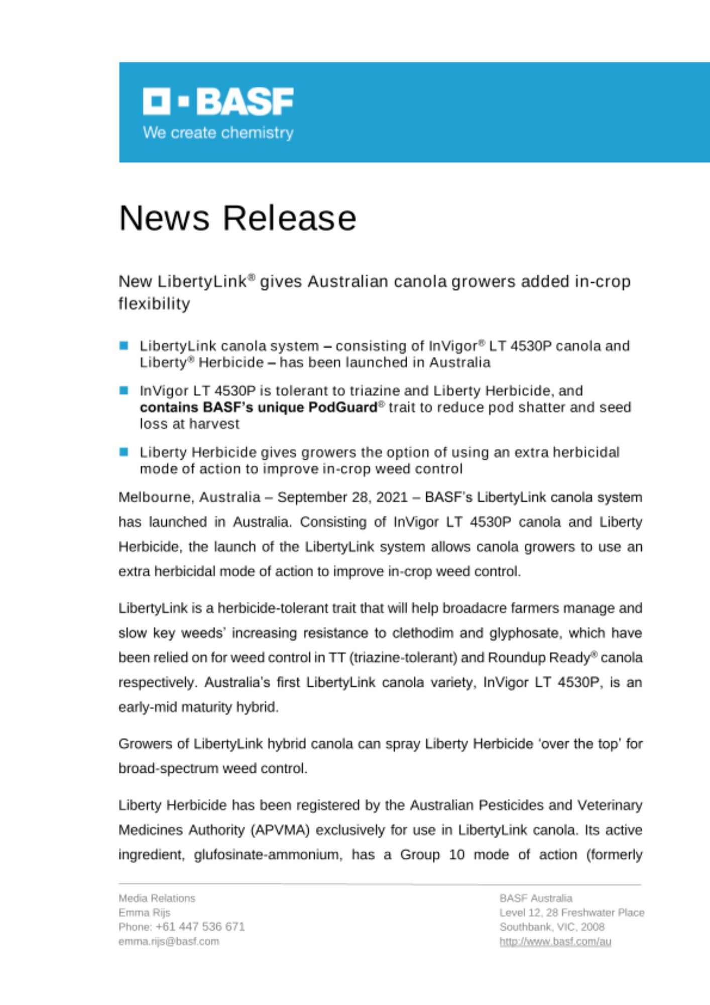 Melbourne, Australia – September 28, 2021 – BASF’s LibertyLink canola system has launched in Australia. Consisting of InVigor LT 4530P canola and Liberty Herbicide, the launch of the LibertyLink system allows canola growers to use an extra herbicidal mode of action to improve in-crop weed control.