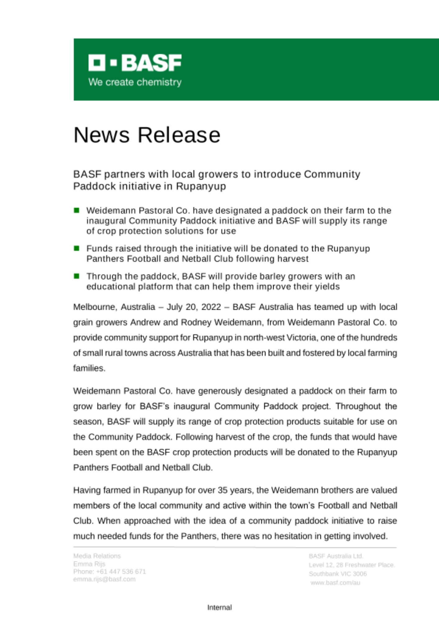 BASF will continue to share updates on the Community Paddock’s performance and its impact on the Rupanyup Panthers Football and Netball Club via BASF’s social media channels.
