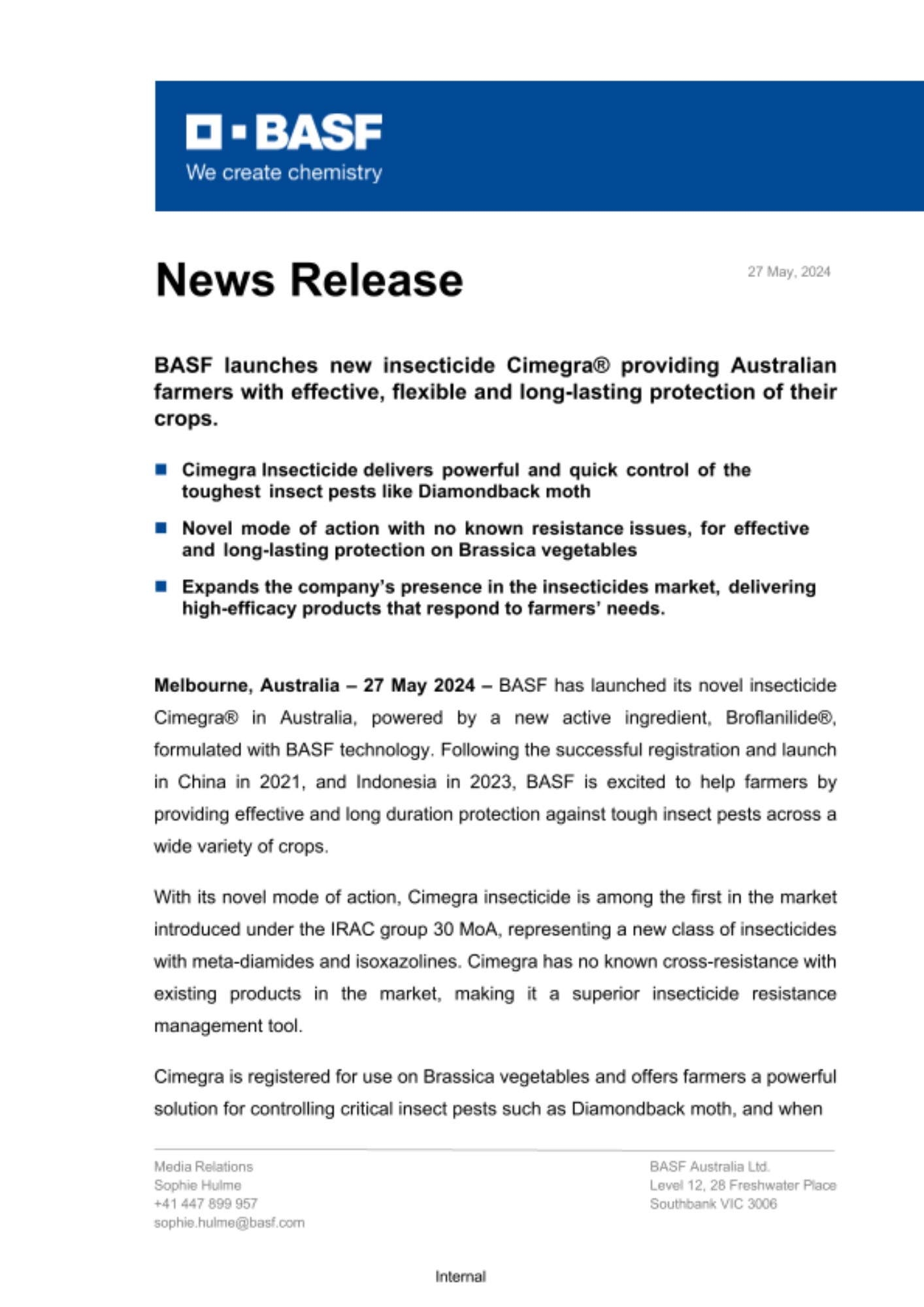 Melbourne, Australia – 27 May 2024 – BASF has launched its novel insecticide Cimegra® in Australia, powered by a new active ingredient, Broflanilide®, formulated with BASF technology. Following the successful registration and launch in China in 2021, and Indonesia in 2023, BASF is excited to help farmers by providing effective and long duration protection against tough insect pests across a wide variety of crops.