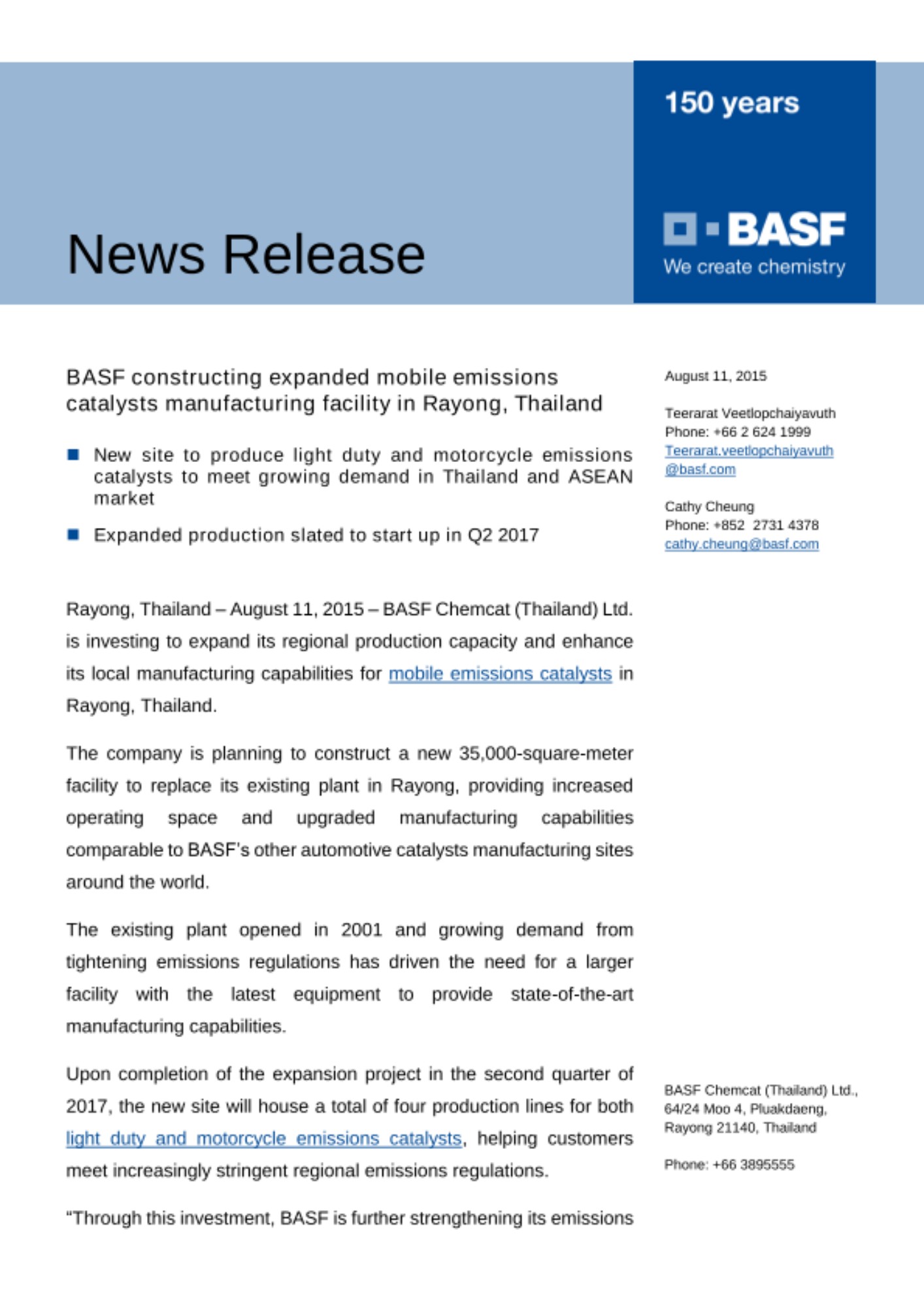 Rayong, Thailand – August 11, 2015 – BASF Chemcat (Thailand) Ltd. is investing to expand its regional production capacity and enhance its local manufacturing capabilities for mobile emissions catalysts in Rayong, Thailand.