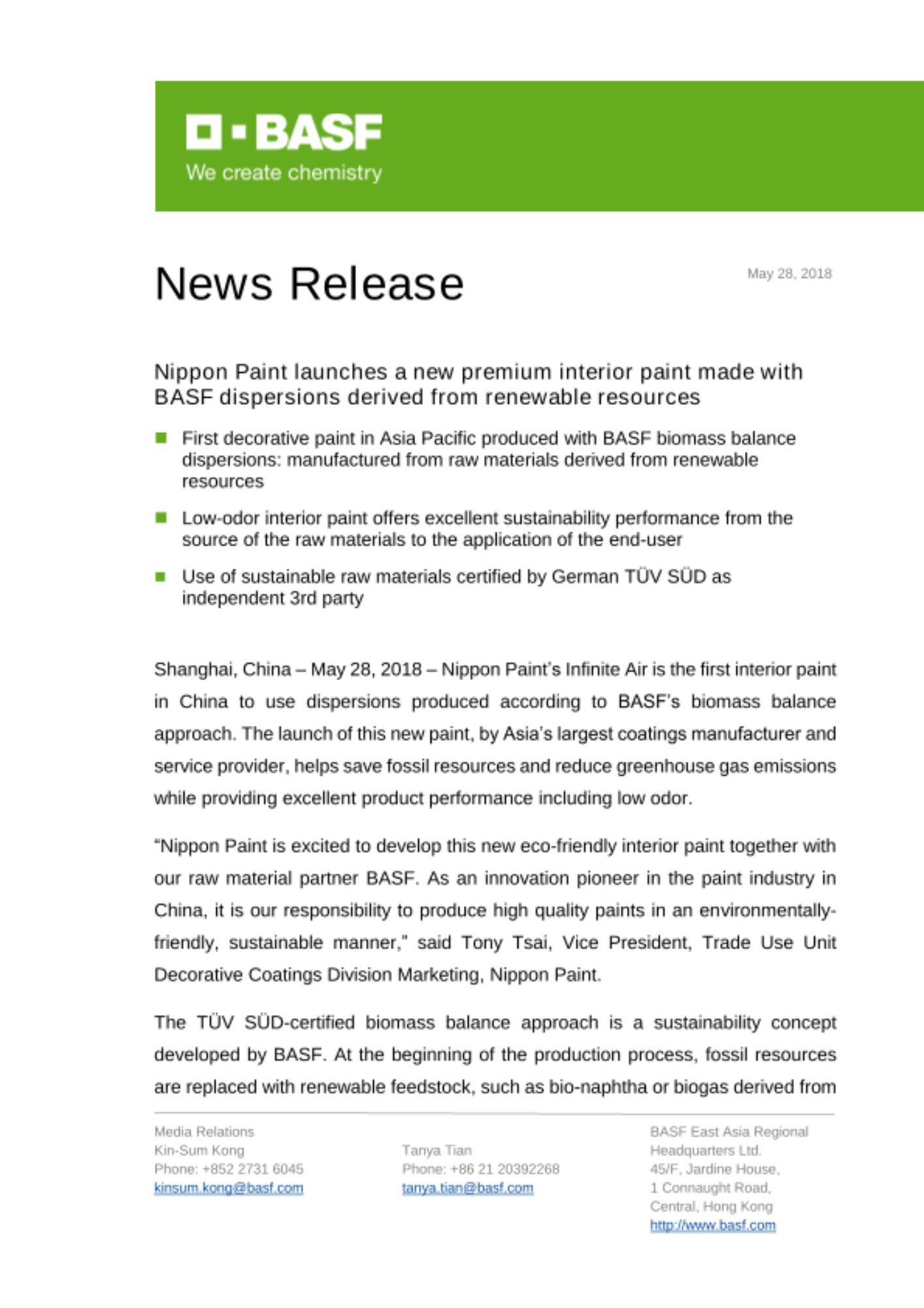Shanghai, China – May 28, 2018 – Nippon Paint’s Infinite Air is the first interior paint in China to use dispersions produced according to BASF’s biomass balance approach. The launch of this new paint, by Asia’s largest coatings manufacturer and service provider, helps save fossil resources and reduce greenhouse gas emissions while providing excellent product performance including low odor.