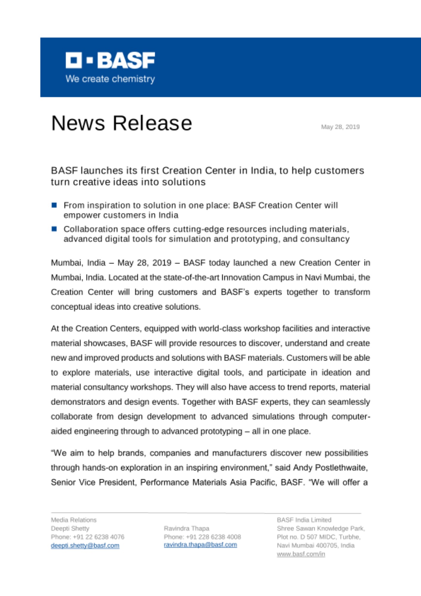 Mumbai, India – May 28, 2019 – BASF today launched a new Creation Center in Mumbai, India. Located at the state-of-the-art Innovation Campus in Navi Mumbai, the Creation Center will bring customers and BASF’s experts together to transform conceptual ideas into creative solutions.