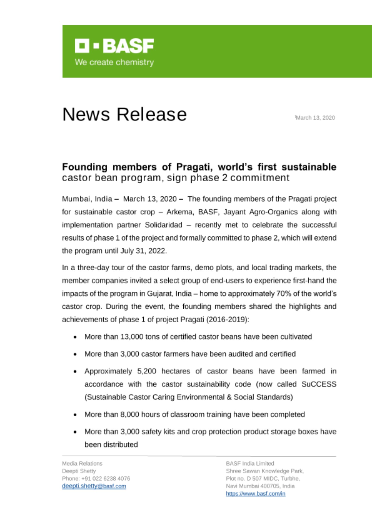 Mumbai, India – March 13, 2020 – The founding members of the Pragati project for sustainable castor crop – Arkema, BASF, Jayant Agro-Organics along with implementation partner Solidaridad – recently met to celebrate the successful results of phase 1 of the project and formally committed to phase 2, which will extend the program until July 31, 2022.