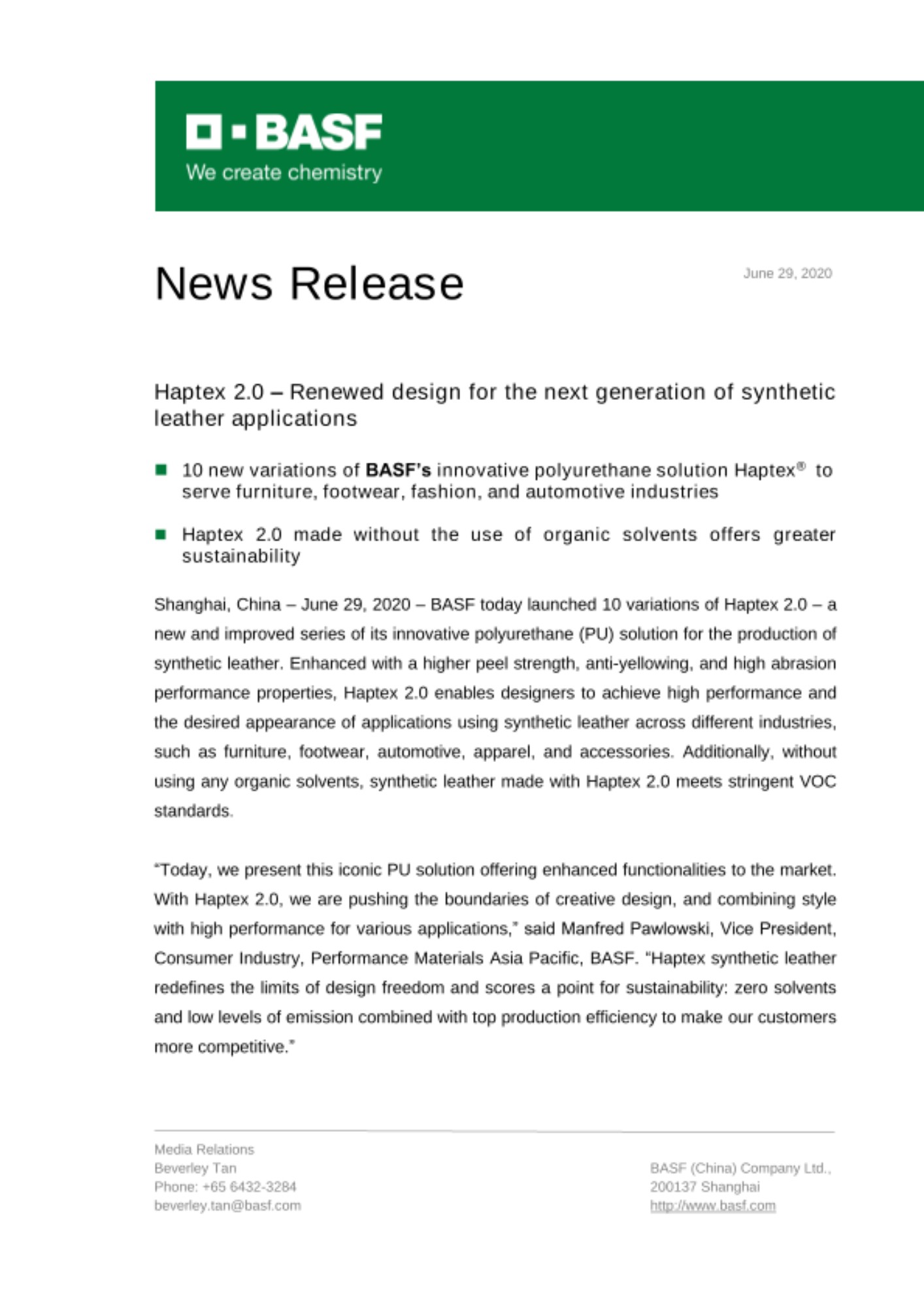 Shanghai, China – June 29, 2020 – BASF today launched 10 variations of Haptex 2.0 – a new and improved series of its innovative polyurethane (PU) solution for the production of synthetic leather. Enhanced with a higher peel strength, anti-yellowing, and high abrasion performance properties, Haptex 2.0 enables designers to achieve high performance and the desired appearance of applications using synthetic leather across different industries, such as furniture, footwear, automotive, apparel, and accessories. Additionally, without using any organic solvents, synthetic leather made with Haptex 2.0 meets stringent VOC standards.
