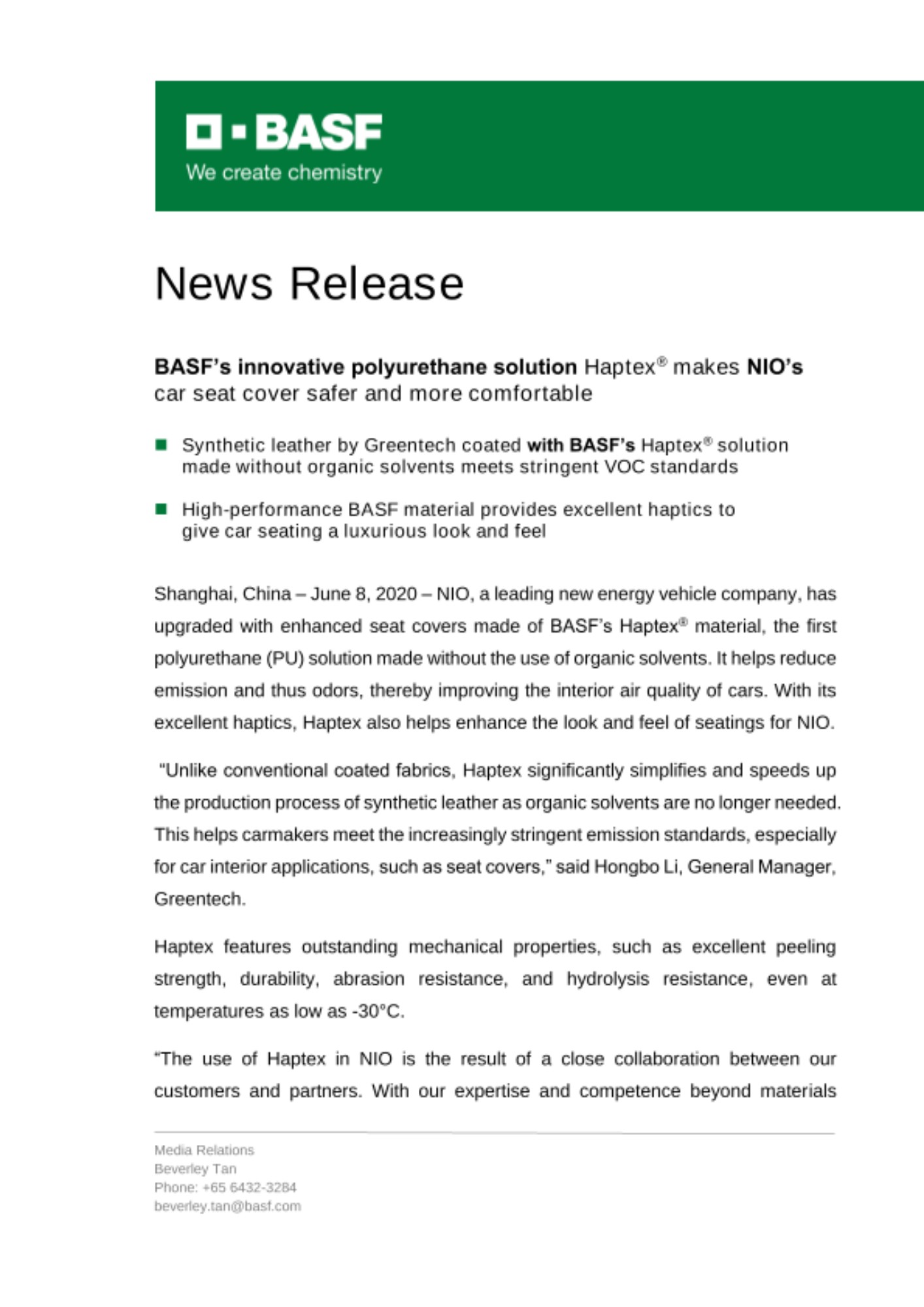 “The use of Haptex in NIO is the result of a close collaboration between our customers and partners. With our expertise and competence beyond materials innovation, we will continue to meet customers’ specific needs and stringent emission regulations,” said Desmond Long, Vice President, Business Management Transportation, Performance Materials Asia Pacific, BASF.