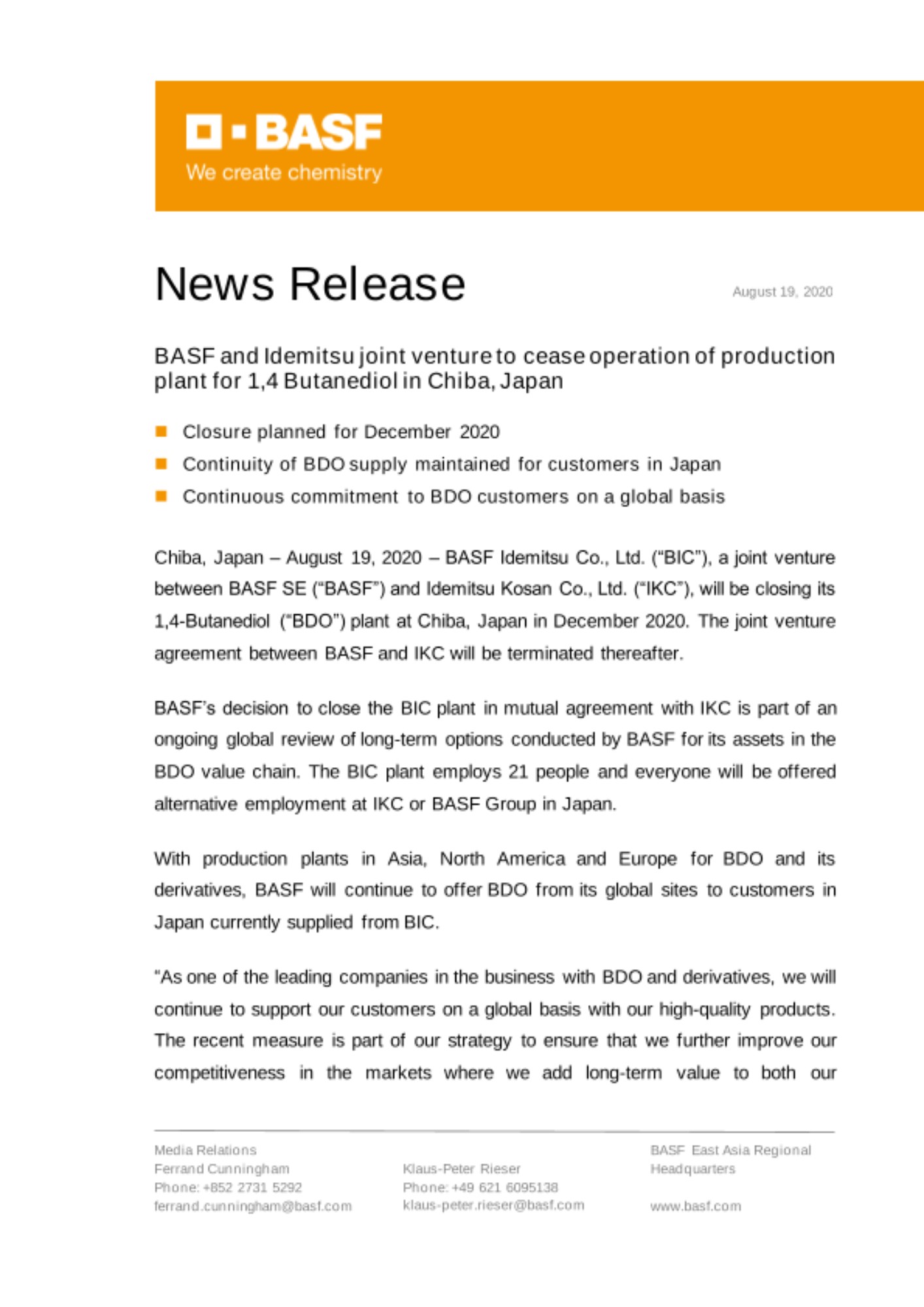 Chiba, Japan – August 19, 2020 – BASF Idemitsu Co., Ltd. (“BIC”), a joint venture between BASF SE (“BASF”) and Idemitsu Kosan Co., Ltd. (“IKC”), will be closing its 1,4-Butanediol (“BDO”) plant at Chiba, Japan in December 2020. The joint venture agreement between BASF and IKC will be terminated thereafter.