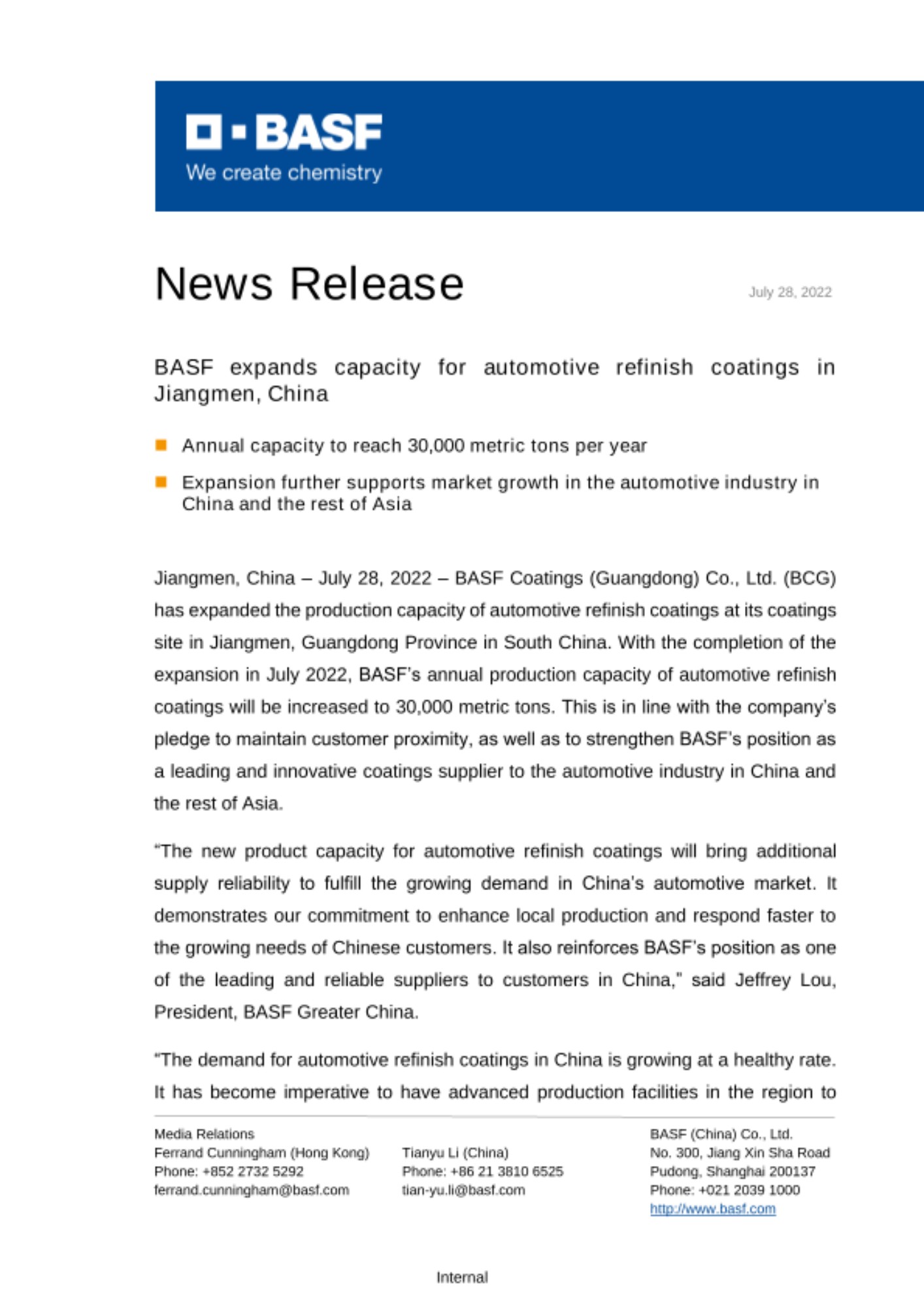 Jiangmen, China – July 28, 2022 – BASF Coatings (Guangdong) Co., Ltd. (BCG) has expanded the production capacity of automotive refinish coatings at its coatings site in Jiangmen, Guangdong Province in South China. With the completion of the expansion in July 2022, BASF’s annual production capacity of automotive refinish coatings will be increased to 30,000 metric tons. This is in line with the company’s pledge to maintain customer proximity, as well as to strengthen BASF’s position as a leading and innovative coatings supplier to the automotive industry in China and the rest of Asia.