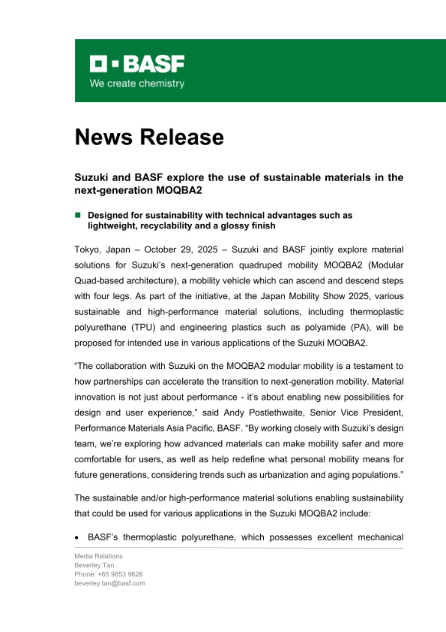 “The collaboration with Suzuki on the MOQBA2 modular mobility is a testament to how partnerships can accelerate the transition to next-generation mobility. Material innovation is not just about performance - it’s about enabling new possibilities for design and user experience,” said Andy Postlethwaite, Senior Vice President, Performance Materials Asia Pacific, BASF. “By working closely with Suzuki’s design team, we’re exploring how advanced materials can make mobility safer and more comfortable for users, as well as help redefine what personal mobility means for future generations, considering trends such as urbanization and aging populations.”