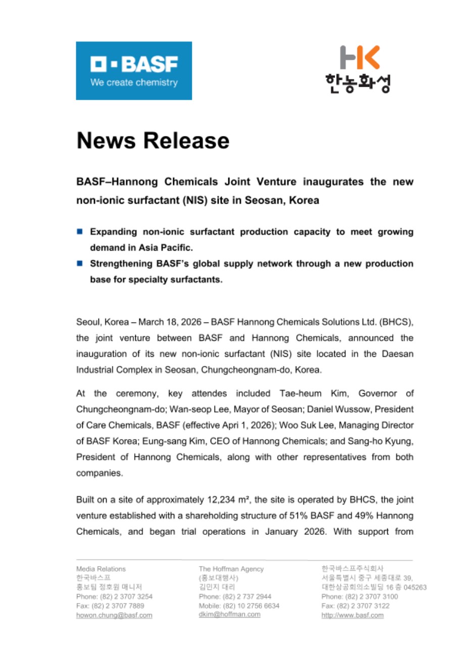Seoul, Korea – March 18, 2026 – BASF Hannong Chemicals Solutions Ltd. (BHCS), the joint venture between BASF and Hannong Chemicals, announced the inauguration of its new non-ionic surfactant (NIS) site located in the Daesan Industrial Complex in Seosan, Chungcheongnam-do, Korea.