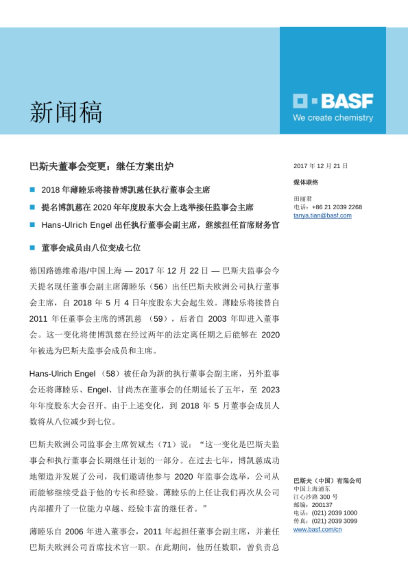 德国路德维希港/中国上海 — 2017 年 12 月 22日 — 巴斯夫监事会今天提名现任董事会副主席薄睦乐(56)出任巴斯夫欧洲公司执行董事会主席,自2018年5月4日年度股东大会起生效。薄睦乐将接替自2011年任董事会主席的博凯慈 (59),后者自2003年即进入董事会。这一变化将使博凯慈在经过两年的法定离任期之后能够在2020年被选为巴斯夫监事会成员和主席。