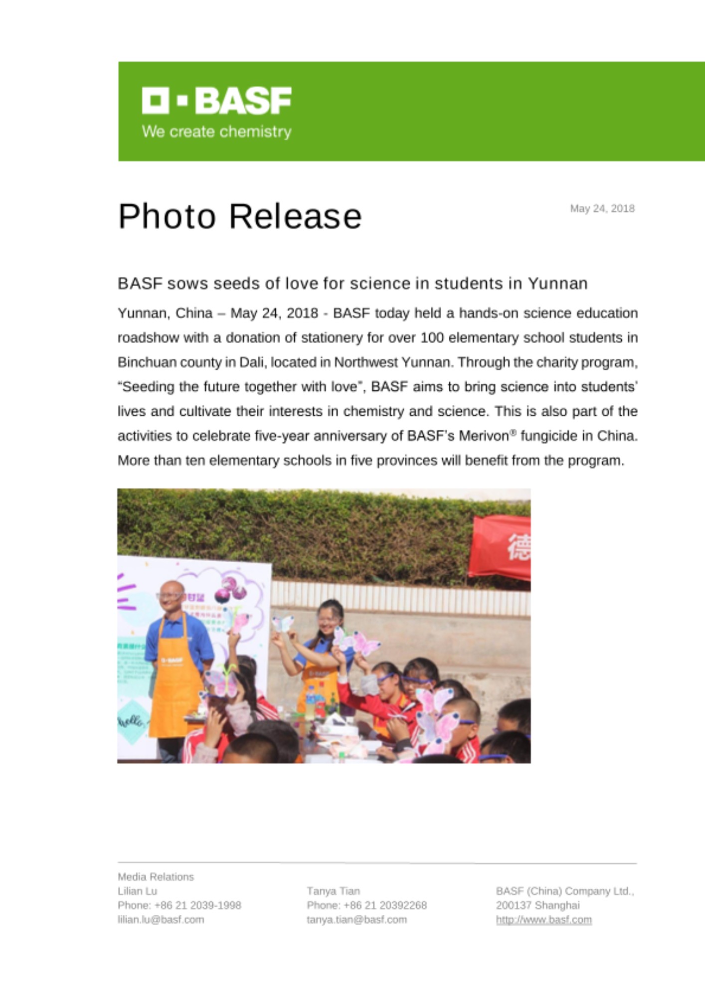 Yunnan, China – May 24, 2018 - BASF today held a hands-on science education roadshow with a donation of stationery for over 100 elementary school students in Binchuan county in Dali, located in Northwest Yunnan. Through the charity program, “Seeding the future together with love”, BASF aims to bring science into students’ lives and cultivate their interests in chemistry and science. This is also part of the activities to celebrate five-year anniversary of BASF’s Merivon® fungicide in China. More than ten elementary schools in five provinces will benefit from the program.