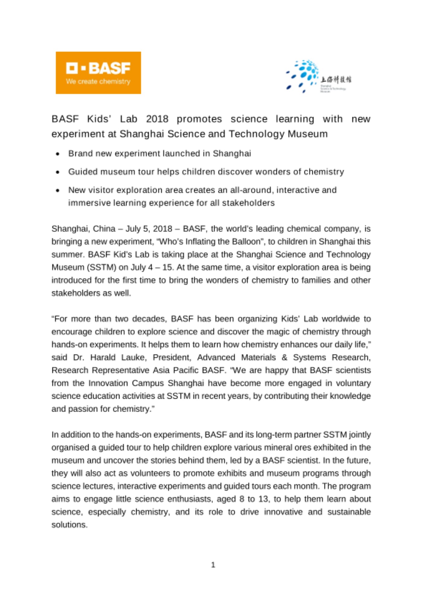 Shanghai, China – July 5, 2018 – BASF, the world’s leading chemical company, is bringing a new experiment, “Who’s Inflating the Balloon”, to children in Shanghai this summer. BASF Kid’s Lab is taking place at the Shanghai Science and Technology Museum (SSTM) on July 4 – 15. At the same time, a visitor exploration area is being introduced for the first time to bring the wonders of chemistry to families and other stakeholders as well.