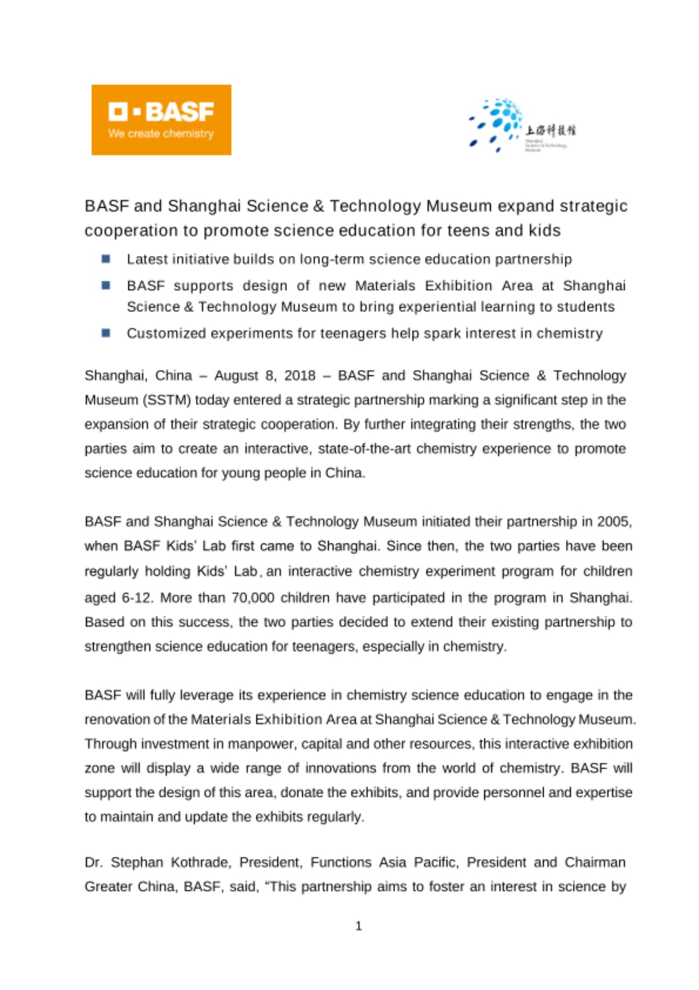 Shanghai, China – August 8, 2018 – BASF and Shanghai Science & Technology Museum (SSTM) today entered a strategic partnership marking a significant step in the expansion of their strategic cooperation. By further integrating their strengths, the two parties aim to create an interactive, state-of-the-art chemistry experience to promote science education for young people in China.