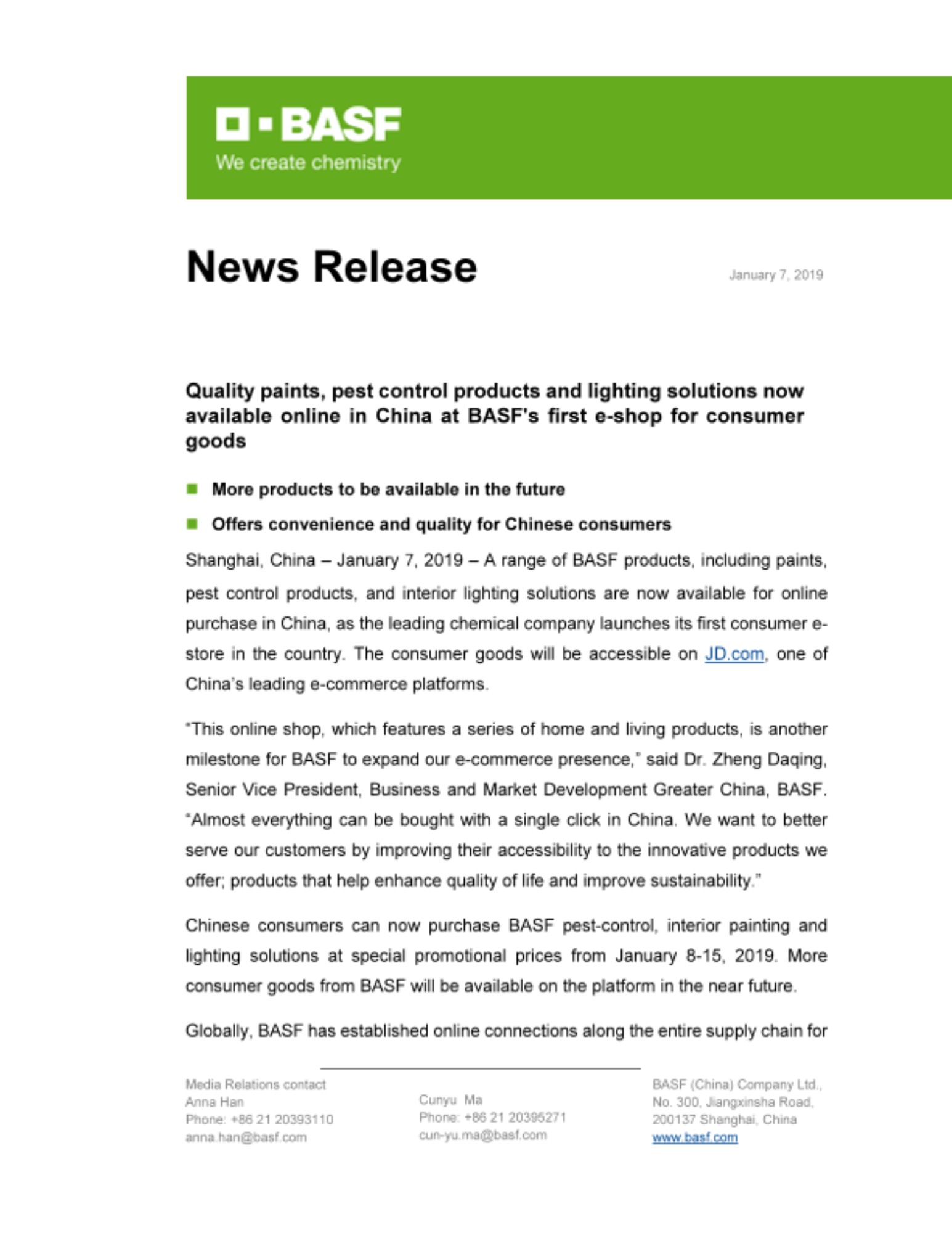 Shanghai, China – January 7, 2019 – A range of BASF products, including paints, pest control products, and interior lighting solutions are now available for online purchase in China, as the leading chemical company launches its first consumer e-store in the country. The consumer goods will be accessible on JD.com, one of China’s leading e-commerce platforms.