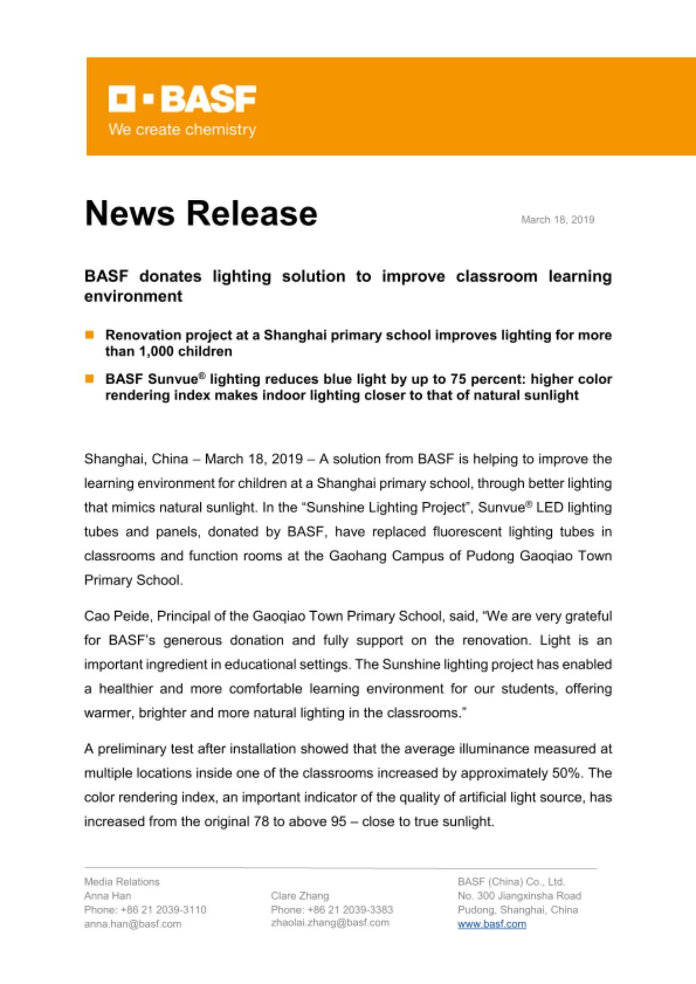 Shanghai, China – March 18, 2019 – A solution from BASF is helping to improve the learning environment for children at a Shanghai primary school, through better lighting that mimics natural sunlight. In the “Sunshine Lighting Project”, Sunvue® LED lighting tubes and panels, donated by BASF, have replaced fluorescent lighting tubes in classrooms and function rooms at the Gaohang Campus of Pudong Gaoqiao Town Primary School.