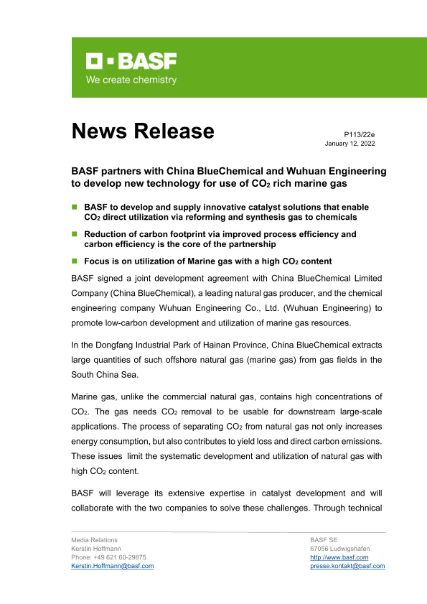 BASF signed a joint development agreement with China BlueChemical Limited Company (China BlueChemical), a leading natural gas producer, and the chemical engineering company Wuhuan Engineering Co., Ltd. (Wuhuan Engineering) to promote low-carbon development and utilization of marine gas resources.