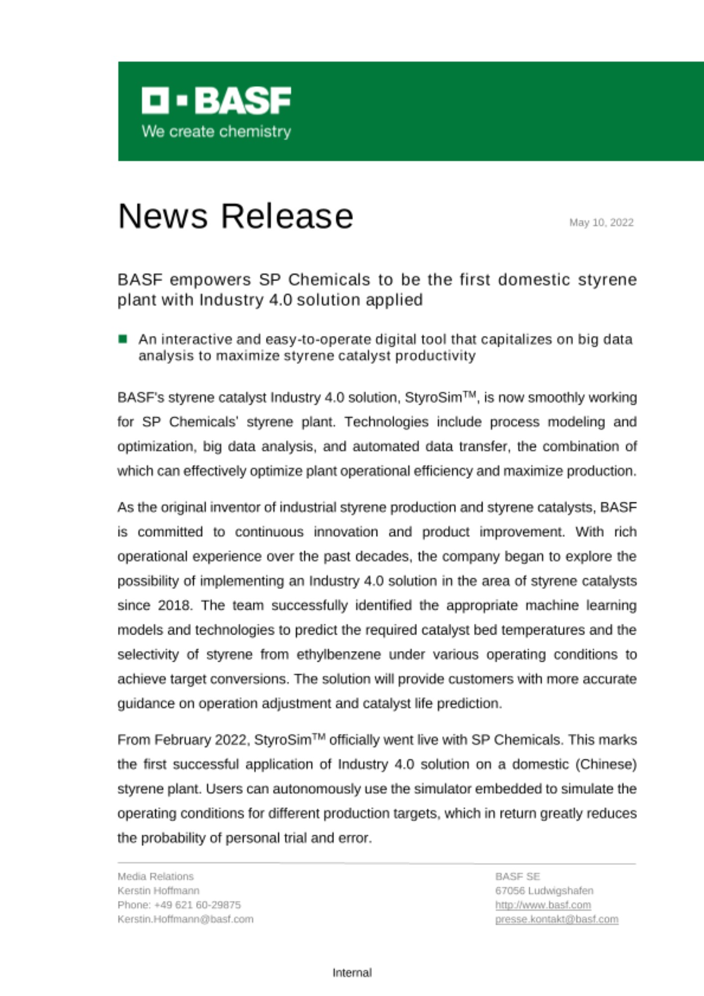 BASF's styrene catalyst Industry 4.0 solution, StyroSimTM, is now smoothly working for SP Chemicals’ styrene plant. Technologies include process modeling and optimization, big data analysis, and automated data transfer, the combination of which can effectively optimize plant operational efficiency and maximize production.