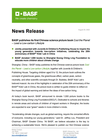 "Accelerating climate changes, such as global warming, require the concerted efforts of everyone, including our young generations,“ said Dr. Jeffrey Lou, President and Chairman, BASF Greater China. “At BASF, we believe education is the key to achieving a sustainable future. We're pleased to publish our first Chinese science picture book with Juvenile & Children's Publishing House and encourage our children to protect our planet by taking concrete actions."