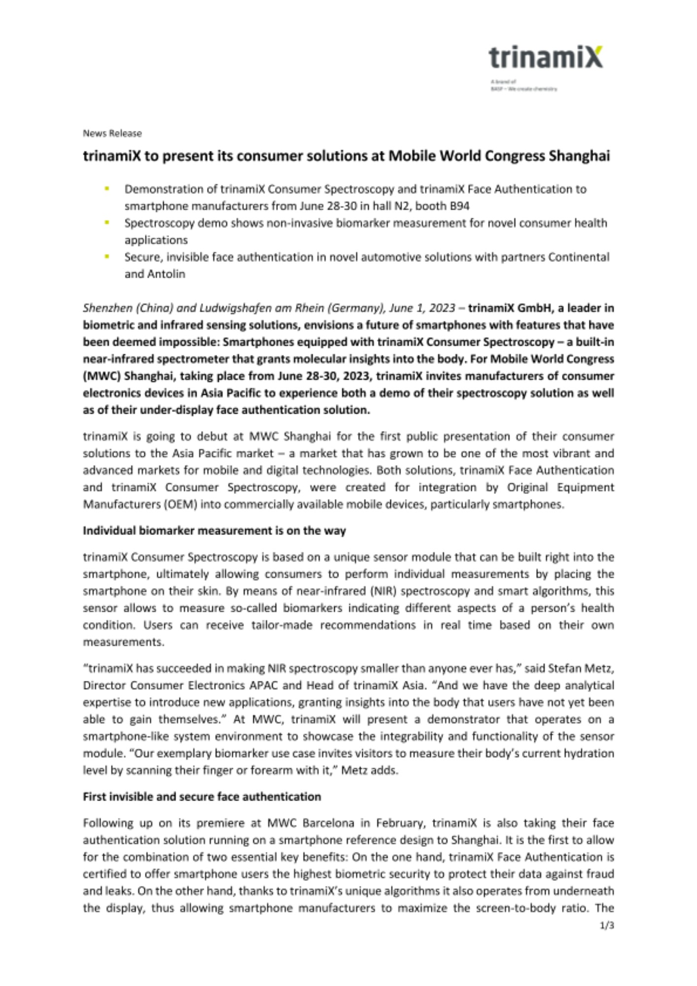 - Demonstration of trinamiX Consumer Spectroscopy and trinamiX Face Authentication to smartphone manufacturers from June 28-30 in hall N2, booth B94