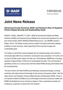 Advancing Circular Economy: BASF and Heraeus’s New JV Supports China's Supply Security and Sustainability Goals