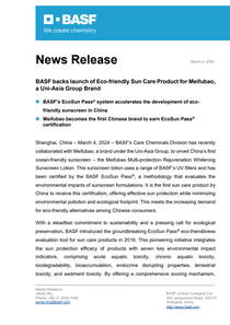 Shanghai, China – March 4, 2024 – BASF’s Care Chemicals Division has recently collaborated with Meifubao, a brand under the Uni-Asia Group, to unveil China’s first ocean-friendly sunscreen – the Meifubao Multi-protection Rejuvenation Whitening Sunscreen Lotion. This sunscreen lotion uses a range of BASF’s UV filters and has been certified by the BASF EcoSun Pass®, a methodology that evaluates the environmental impacts of sunscreen formulations. It is the first sun care product by China to receive this certification, offering effective sun protection while minimizing environmental pollution and ecological footprint. This meets the increasing demand for eco-friendly alternatives among Chinese consumers.