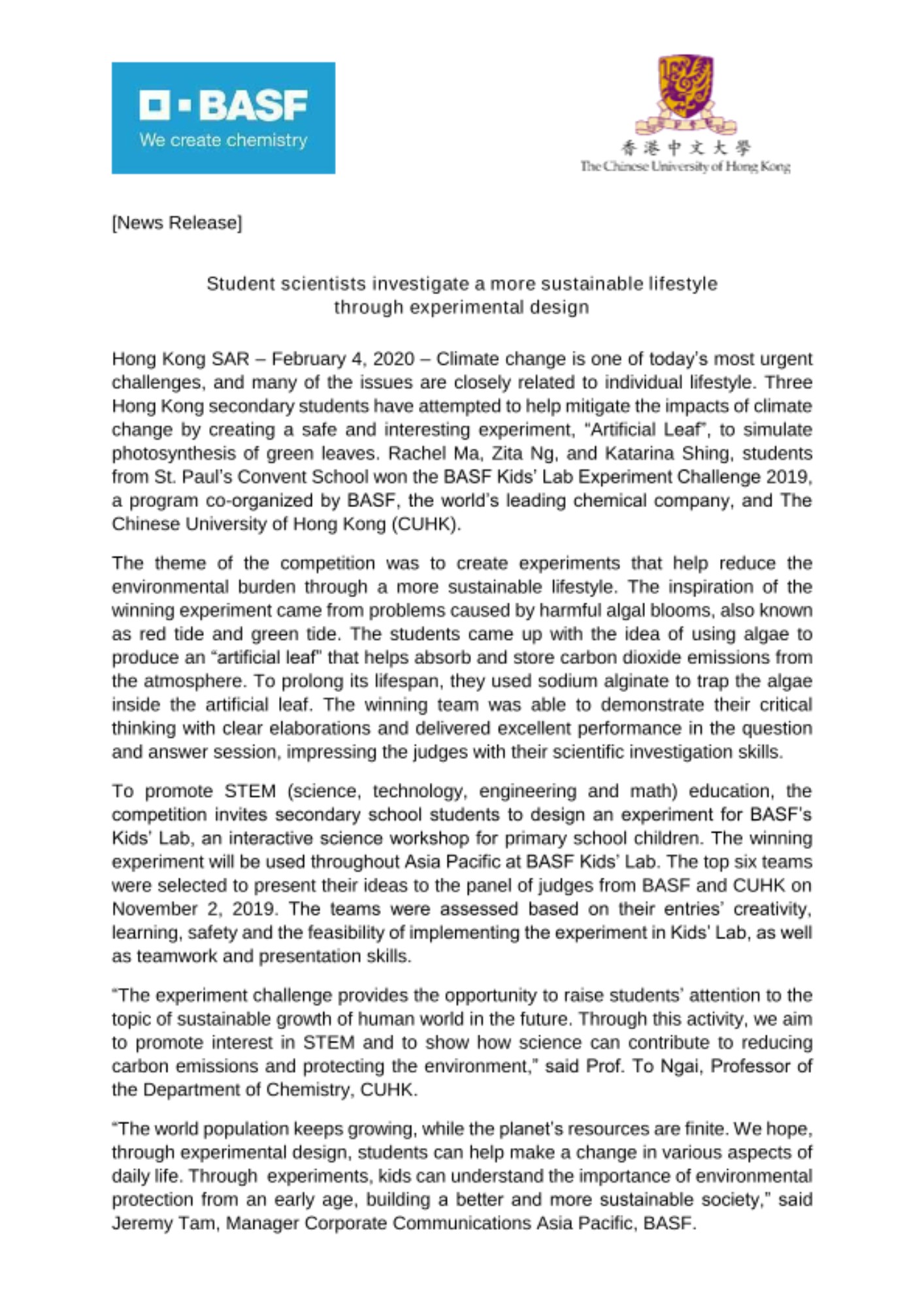Hong Kong SAR – February 4, 2020 – Climate change is one of today’s most urgent challenges, and many of the issues are closely related to individual lifestyle. Three Hong Kong secondary students have attempted to help mitigate the impacts of climate change by creating a safe and interesting experiment, “Artificial Leaf”, to simulate photosynthesis of green leaves. Rachel Ma, Zita Ng, and Katarina Shing, students from St. Paul’s Convent School won the BASF Kids’ Lab Experiment Challenge 2019, a program co-organized by BASF, the world’s leading chemical company, and The Chinese University of Hong Kong (CUHK).