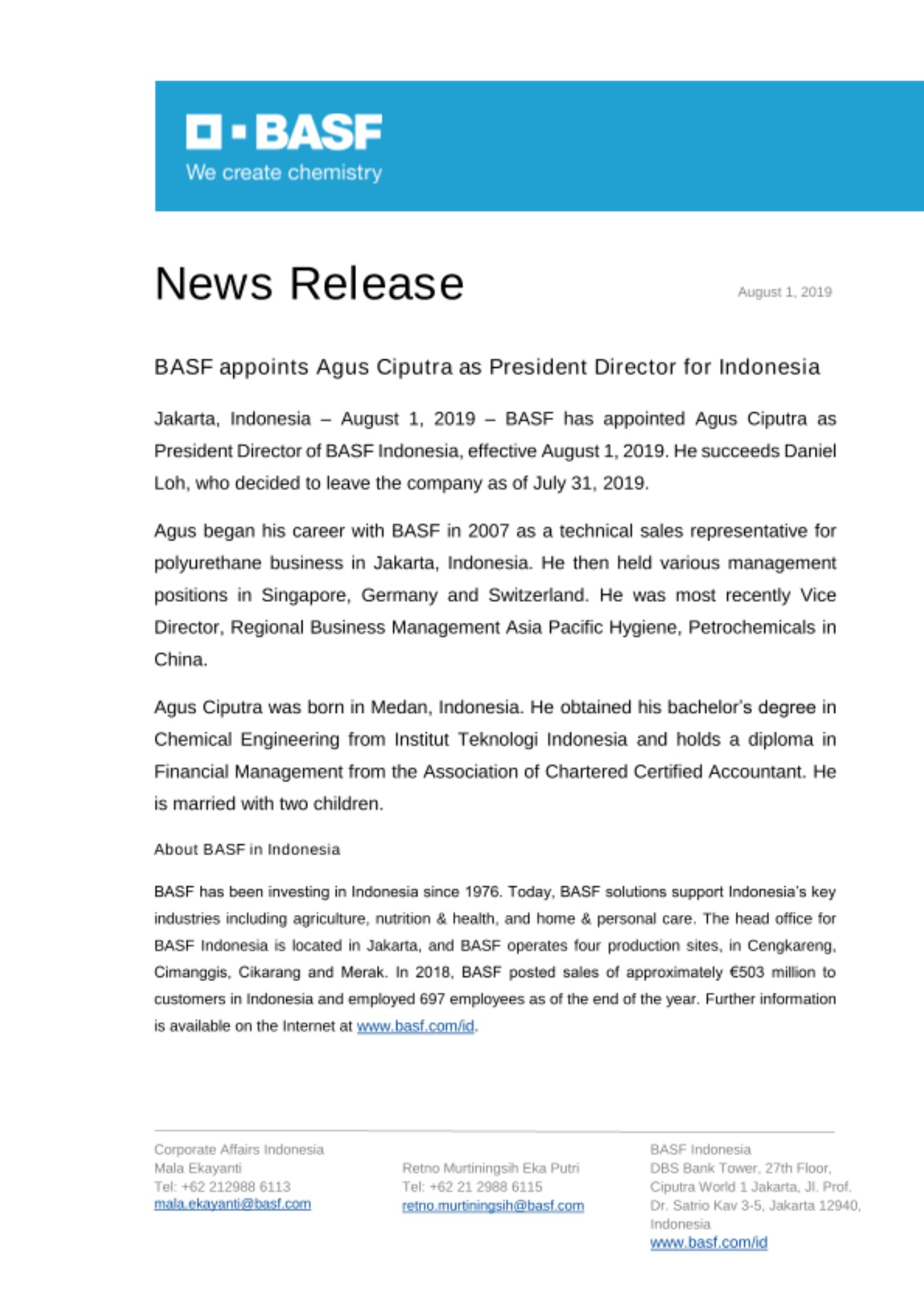Jakarta, Indonesia – August 1, 2019 – BASF has appointed Agus Ciputra as President Director of BASF Indonesia, effective August 1, 2019. He succeeds Daniel Loh, who decided to leave the company as of July 31, 2019.