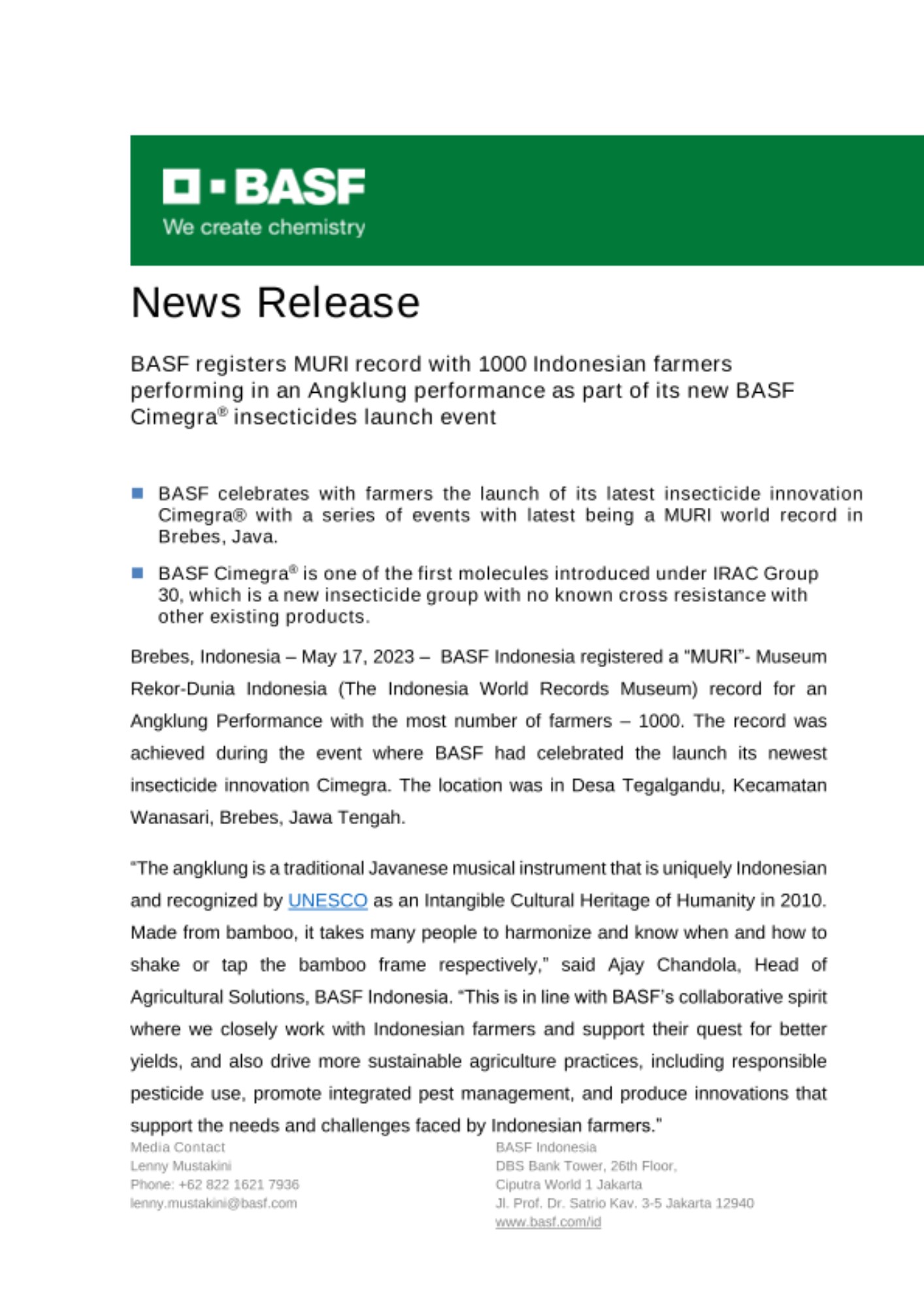 - BASF celebrates with farmers the launch of its latest insecticide innovation Cimegra® with a series of events with latest being a MURI world record in Brebes, Java.