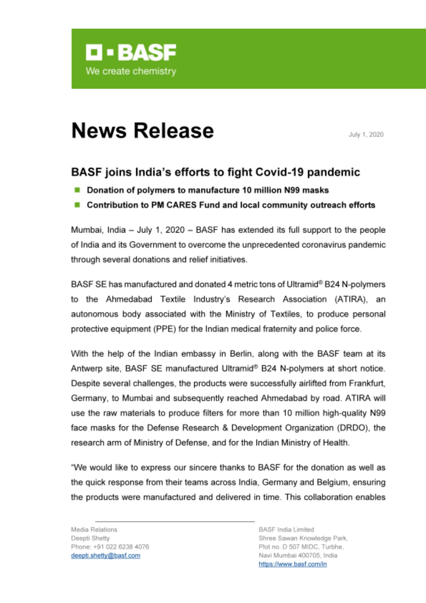 Additionally, BASF in India is supporting the efforts to fight the pandemic in the country in various ways: