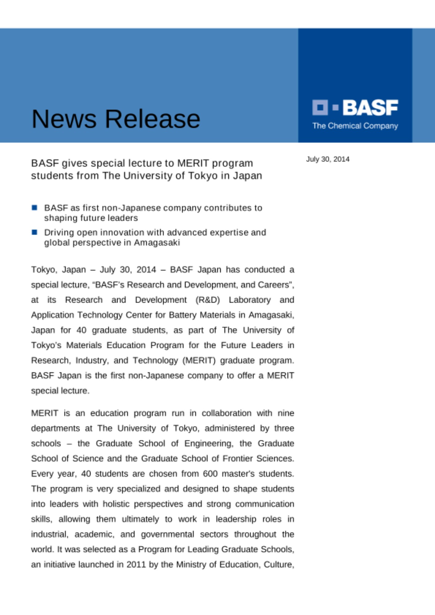 Tokyo, Japan – July 30, 2014 – BASF Japan has conducted a special lecture, “BASF’s Research and Development, and Careers”, at its Research and Development (R&D) Laboratory and Application Technology Center for Battery Materials in Amagasaki, Japan for 40 graduate students, as part of The University of Tokyo’s Materials Education Program for the Future Leaders in Research, Industry, and Technology (MERIT) graduate program. BASF Japan is the first non-Japanese company to offer a MERIT special lecture.