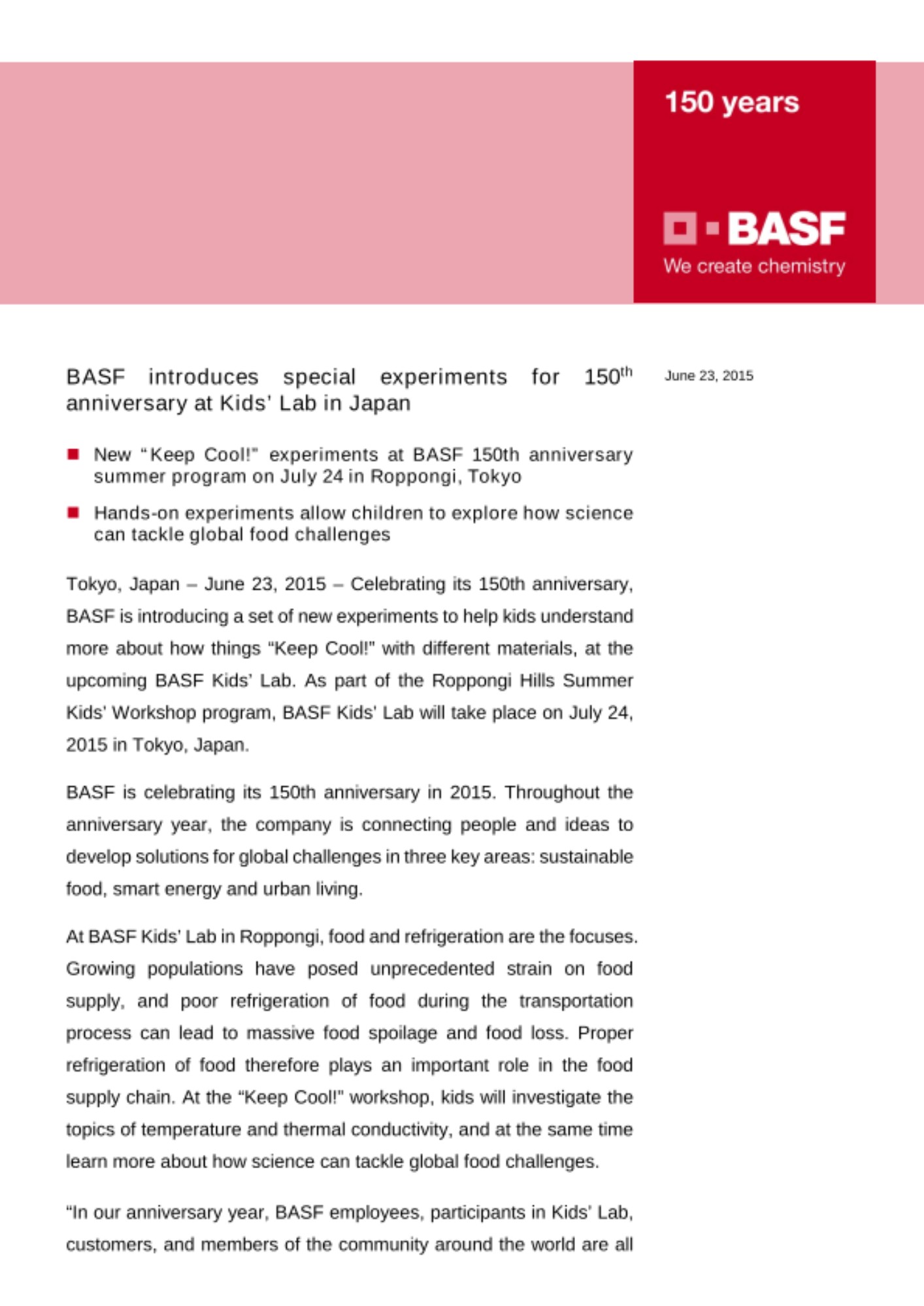- New “Keep Cool!” experiments at BASF 150th anniversary summer program on July 24 in Roppongi, Tokyo