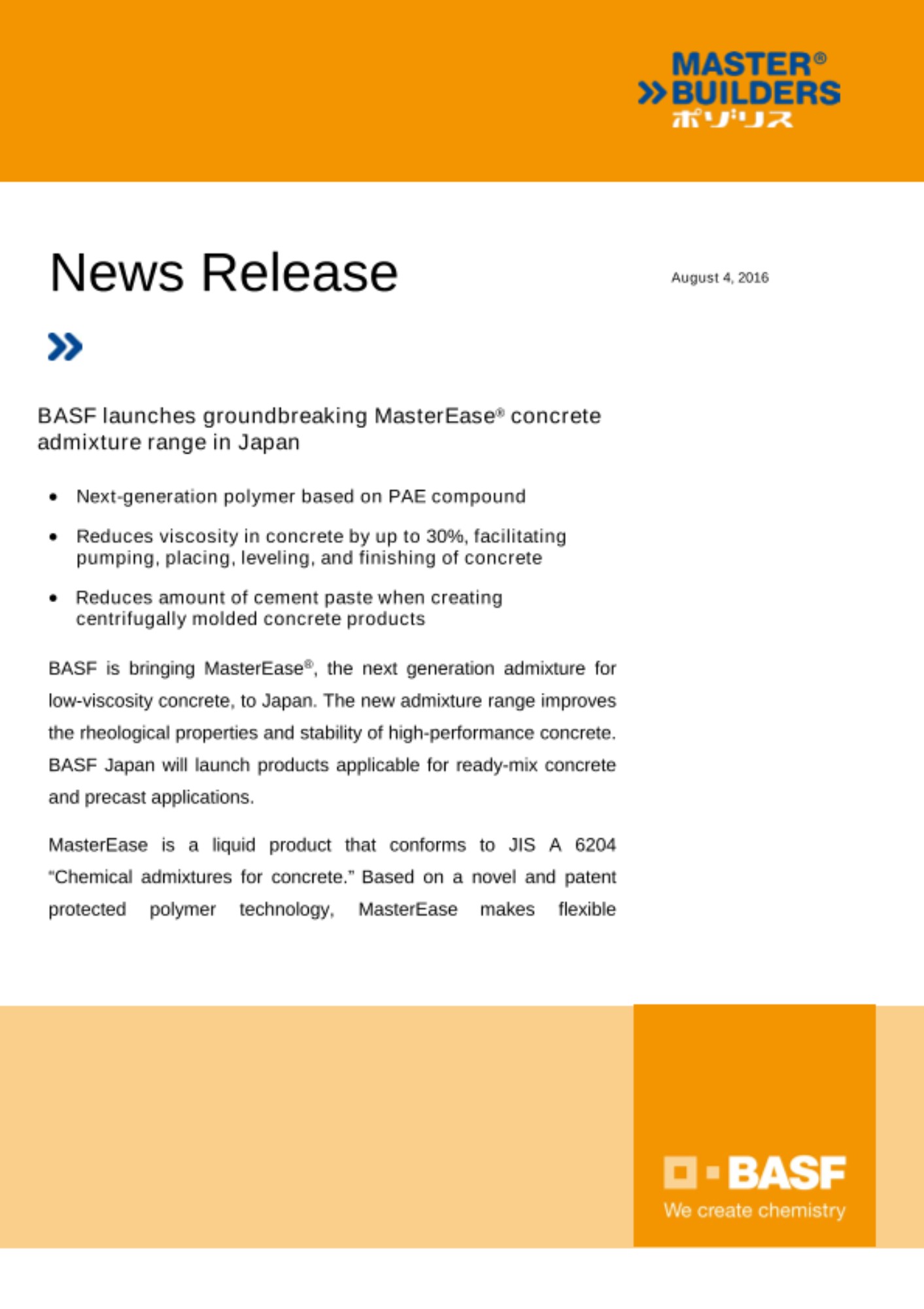 Takahiro Ikeda, Director of Construction Chemicals, BASF Japan, said, “Innovation is the key driver to our company’s growth. MasterEase is an embodiment of that innovation. I believe that this new product can help our customers save labor cost, improve efficient and quality, and reduce environmental impact.”