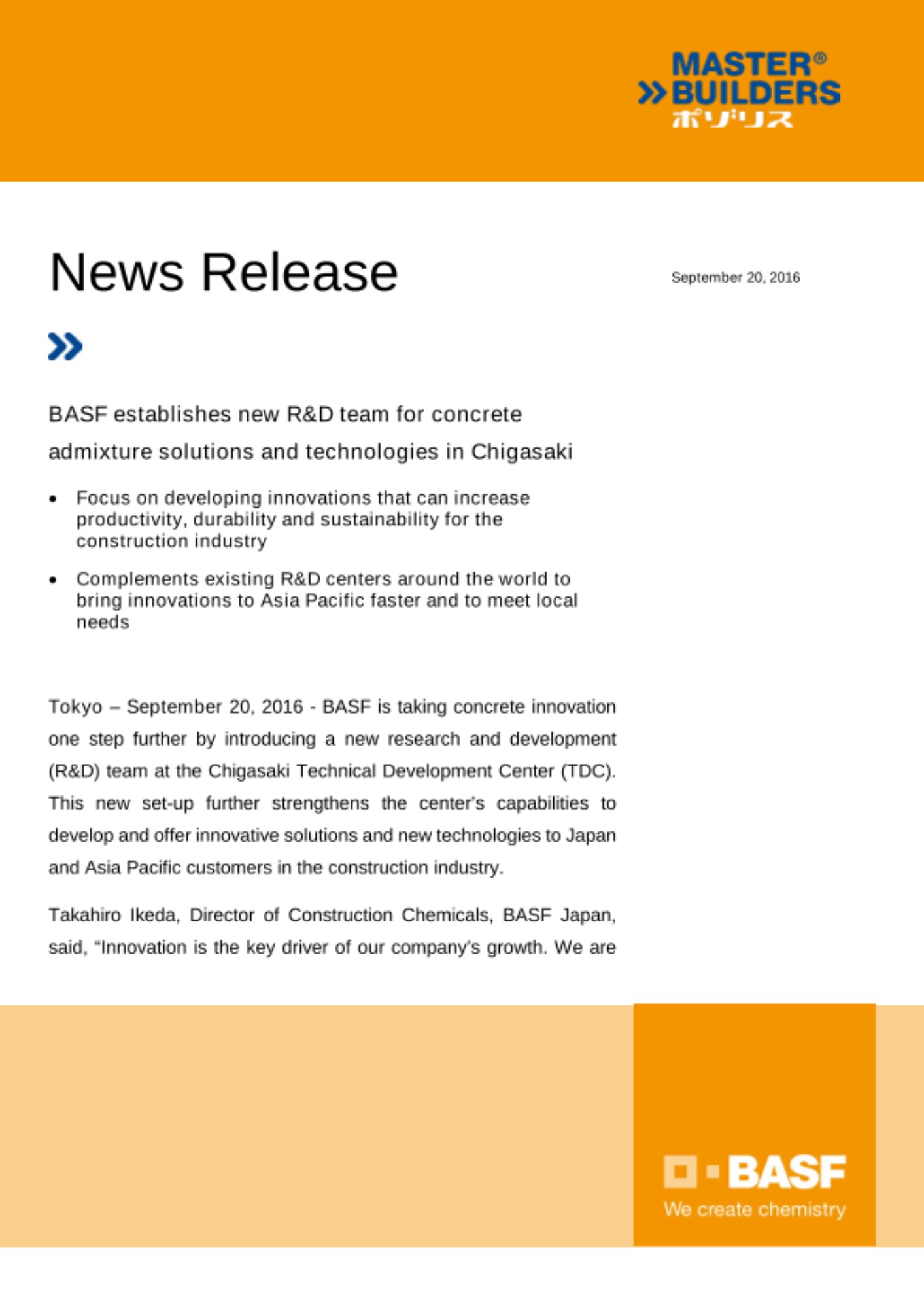 Tokyo – September 20, 2016 - BASF is taking concrete innovation one step further by introducing a new research and development (R&D) team at the Chigasaki Technical Development Center (TDC). This new set-up further strengthens the center’s capabilities to develop and offer innovative solutions and new technologies to Japan and Asia Pacific customers in the construction industry.