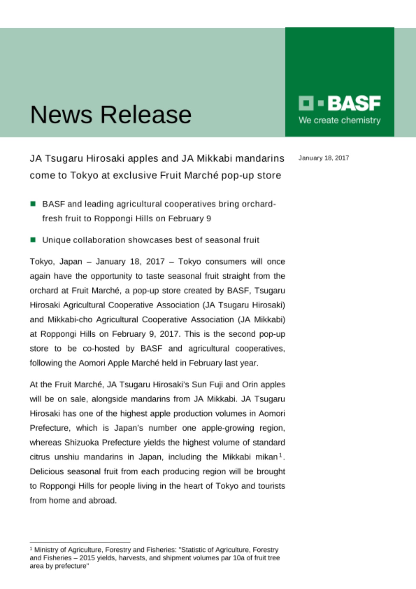 - BASF and leading agricultural cooperatives bring orchard-fresh fruit to Roppongi Hills on February 9