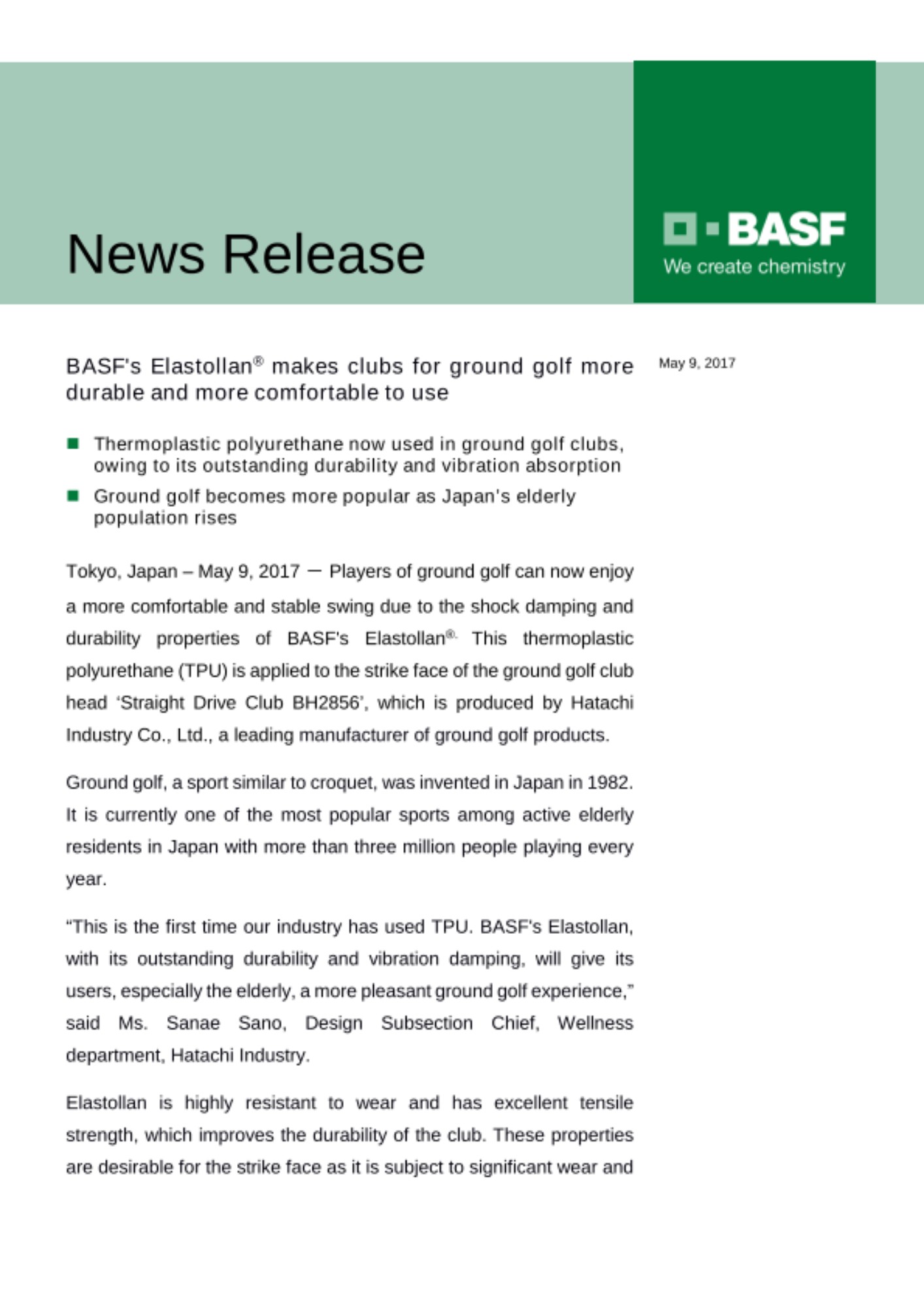 Tokyo, Japan – May 9, 2017 - Players of ground golf can now enjoy a more comfortable and stable swing due to the shock damping and durability properties of BASF's Elastollan®. This thermoplastic polyurethane (TPU) is applied to the strike face of the ground golf club head ‘Straight Drive Club BH2856’, which is produced by Hatachi Industry Co., Ltd., a leading manufacturer of ground golf products.