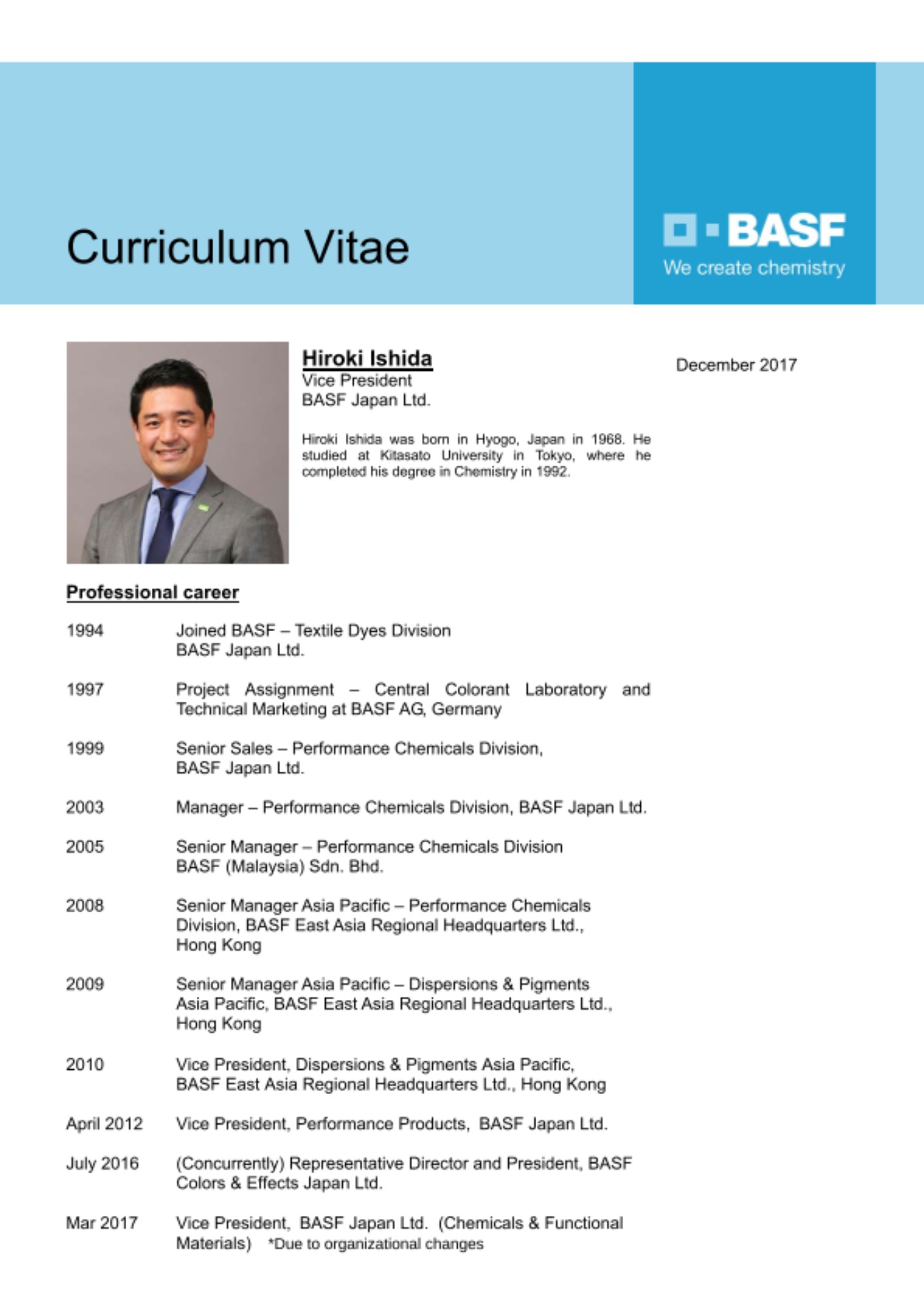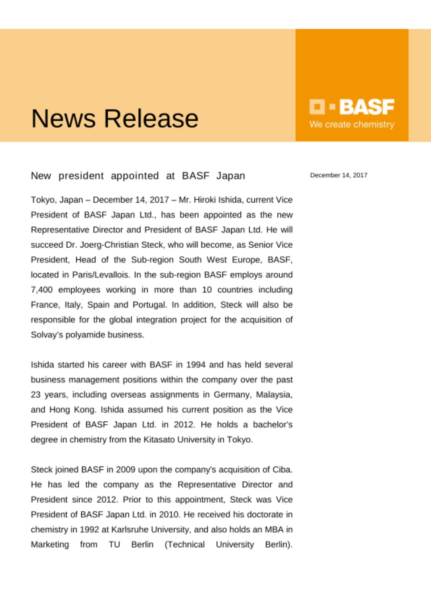 Tokyo, Japan – December 14, 2017 – Mr. Hiroki Ishida, current Vice President of BASF Japan Ltd., has been appointed as the new Representative Director and President of BASF Japan Ltd. He will succeed Dr. Joerg-Christian Steck, who will become, as Senior Vice President, Head of the Sub-region South West Europe, BASF, located in Paris/Levallois. In the sub-region BASF employs around 7,400 employees working in more than 10 countries including France, Italy, Spain and Portugal. In addition, Steck will also be responsible for the global integration project for the acquisition of Solvay’s polyamide business.