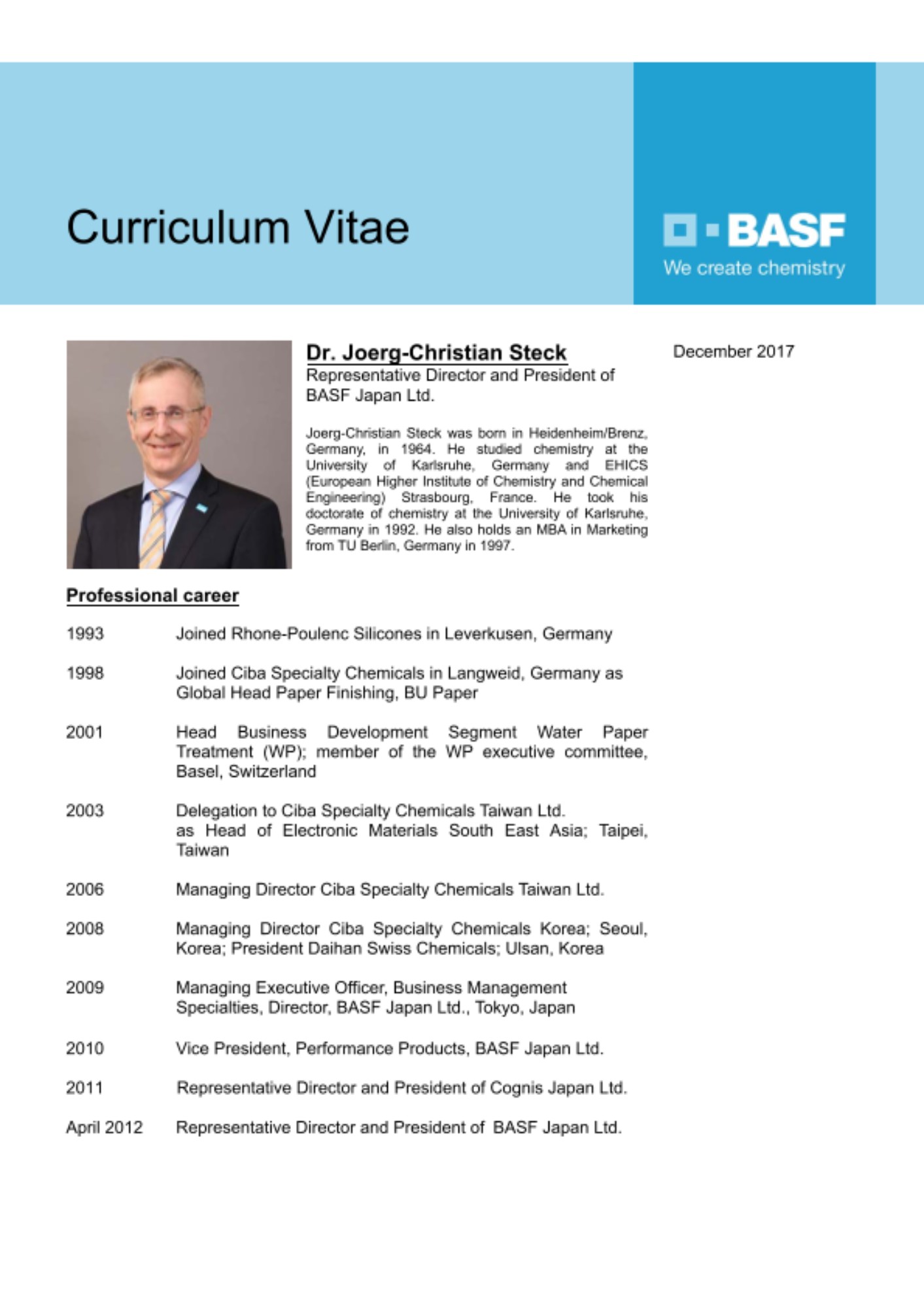 Steck joined BASF in 2009 upon the company's acquisition of Ciba. He has led the company as the Representative Director and President since 2012. Prior to this appointment, Steck was Vice President of BASF Japan Ltd. in 2010. He received his doctorate in chemistry in 1992 at Karlsruhe University, and also holds an MBA in Marketing from TU Berlin (Technical University Berlin).