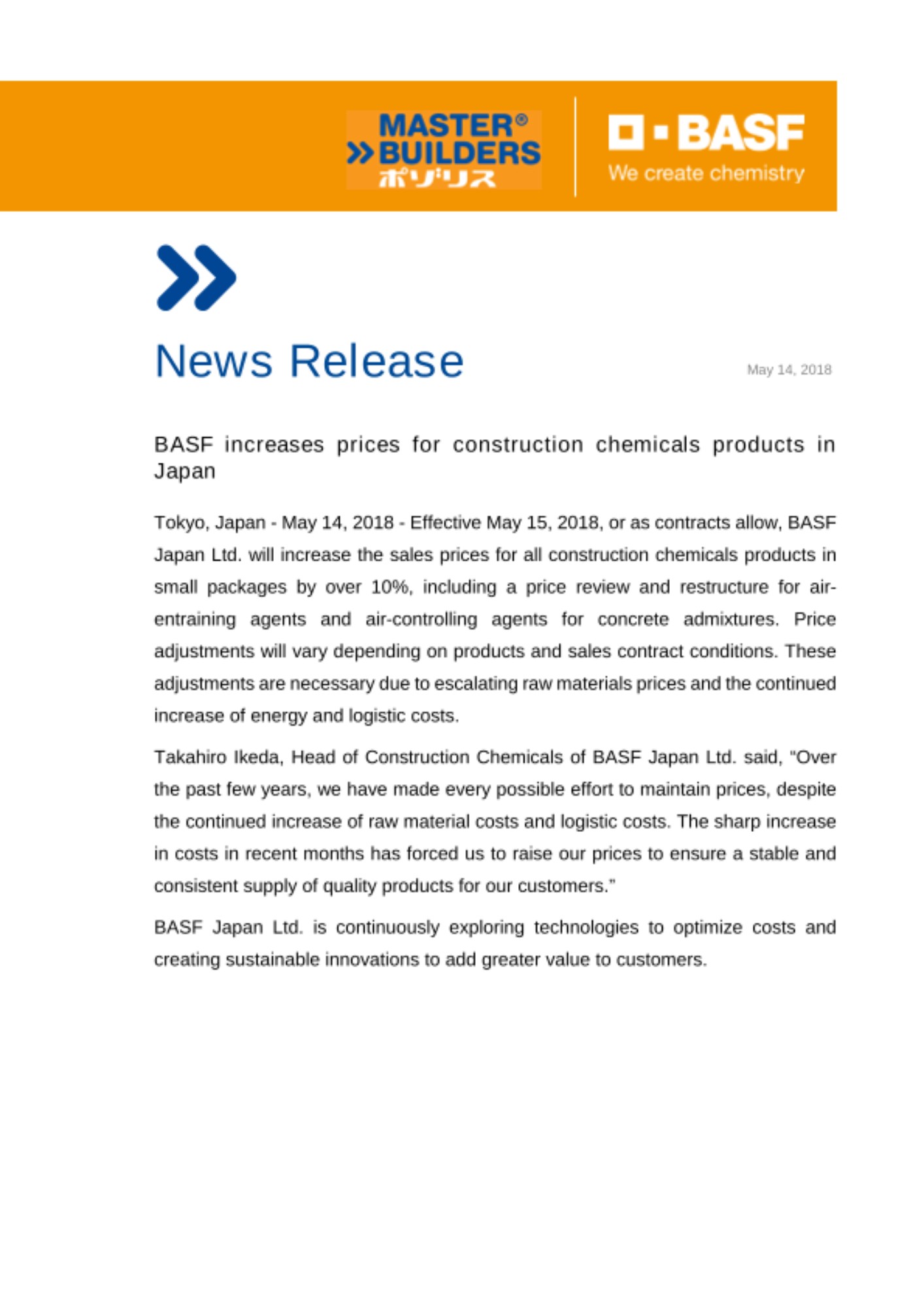 Tokyo, Japan - May 14, 2018 - Effective May 15, 2018, or as contracts allow, BASF Japan Ltd. will increase the sales prices for all construction chemicals products in small packages by over 10%, including a price review and restructure for air-entraining agents and air-controlling agents for concrete admixtures. Price adjustments will vary depending on products and sales contract conditions. These adjustments are necessary due to escalating raw materials prices and the continued increase of energy and logistic costs.