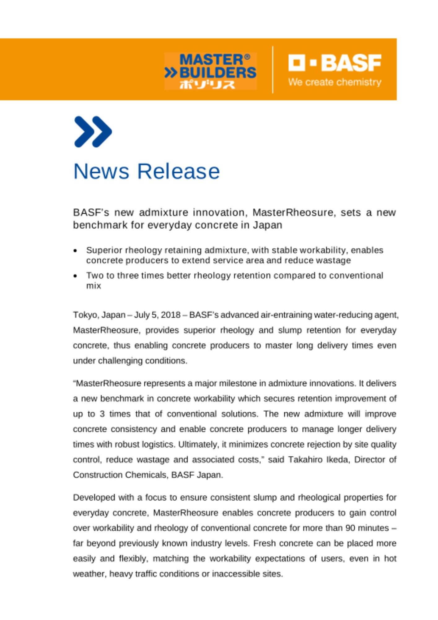 Tokyo, Japan – July 5, 2018 – BASF’s advanced air-entraining water-reducing agent, MasterRheosure, provides superior rheology and slump retention for everyday concrete, thus enabling concrete producers to master long delivery times even under challenging conditions.