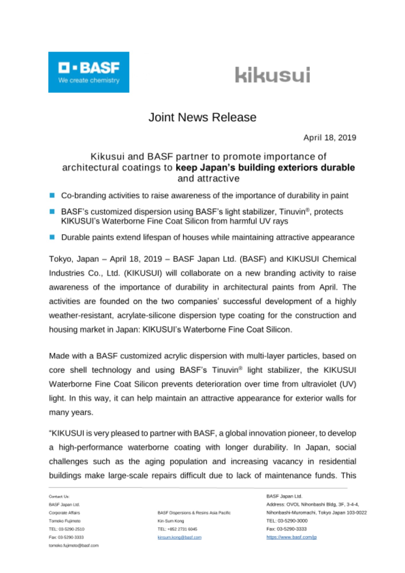 Tokyo, Japan – April 18, 2019 – BASF Japan Ltd. (BASF) and KIKUSUI Chemical Industries Co., Ltd. (KIKUSUI) will collaborate on a new branding activity to raise awareness of the importance of durability in architectural paints from April. The activities are founded on the two companies’ successful development of a highly weather-resistant, acrylate-silicone dispersion type coating for the construction and housing market in Japan: KIKUSUI’s Waterborne Fine Coat Silicon.