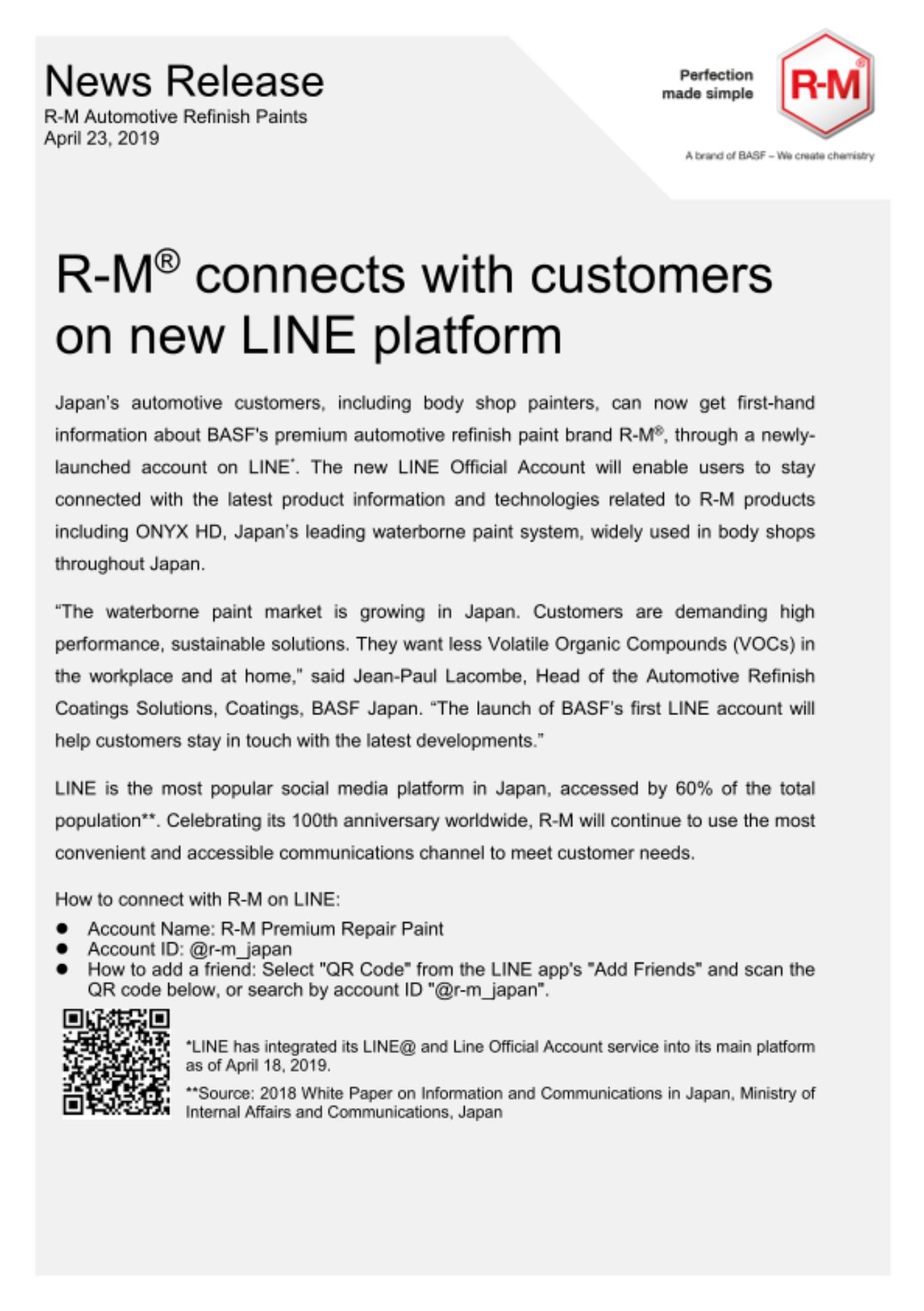Japan’s automotive customers, including body shop painters, can now get first-hand information about BASF's premium automotive refinish paint brand R-M®, through a newly-launched account on LINE*. The new LINE Official Account will enable users to stay connected with the latest product information and technologies related to R-M products including ONYX HD, Japan’s leading waterborne paint system, widely used in body shops throughout Japan.
