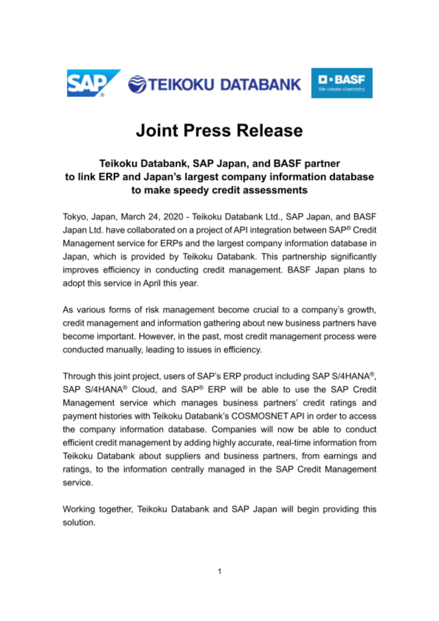 Tokyo, Japan, March 24, 2020 - Teikoku Databank Ltd., SAP Japan, and BASF Japan Ltd. have collaborated on a project of API integration between SAP® Credit Management service for ERPs and the largest company information database in Japan, which is provided by Teikoku Databank. This partnership significantly improves efficiency in conducting credit management. BASF Japan plans to adopt this service in April this year.