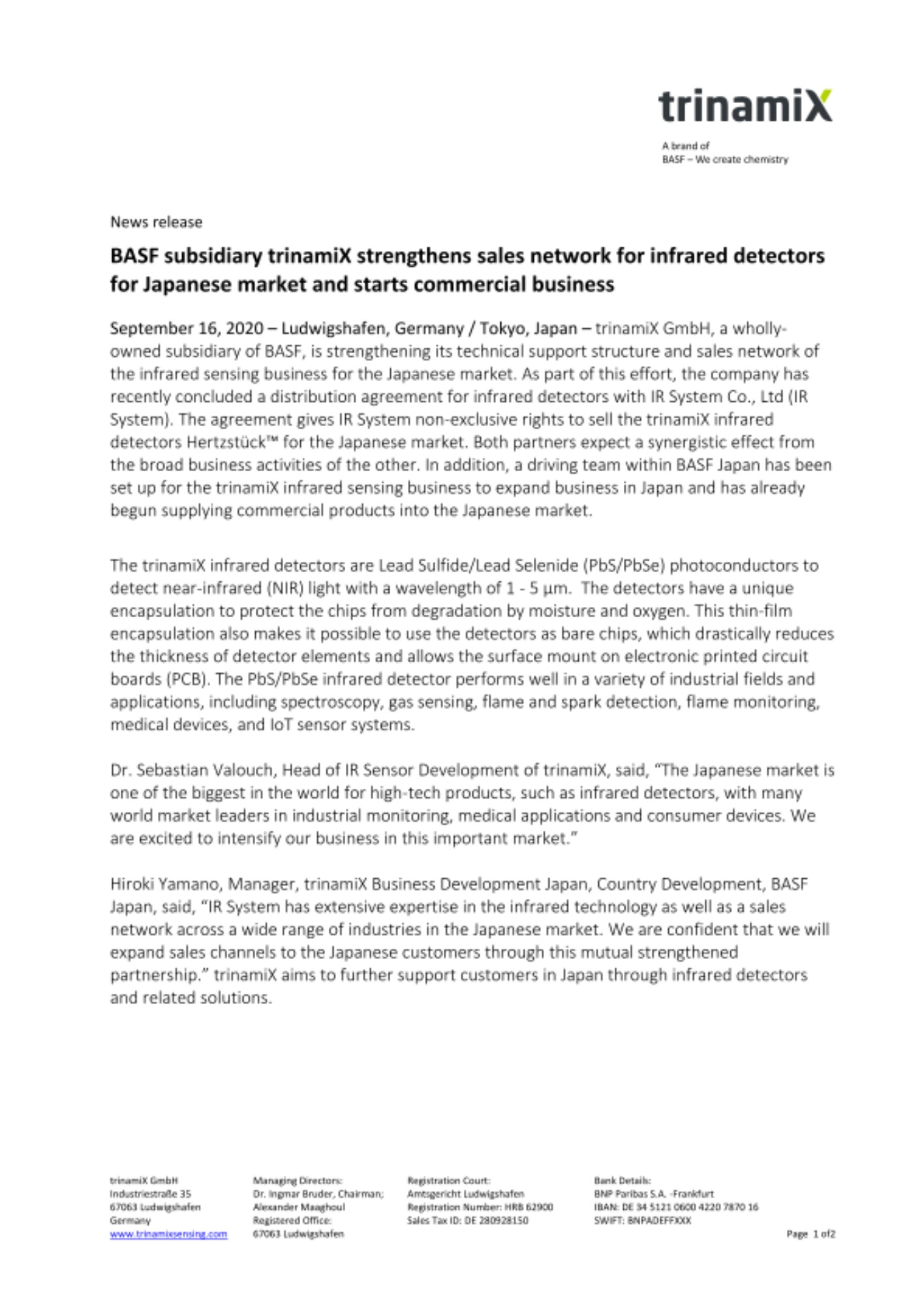 September 16, 2020 – Ludwigshafen, Germany / Tokyo, Japan – trinamiX GmbH, a wholly-owned subsidiary of BASF, is strengthening its technical support structure and sales network of the infrared sensing business for the Japanese market. As part of this effort, the company has recently concluded a distribution agreement for infrared detectors with IR System Co., Ltd (IR System). The agreement gives IR System non-exclusive rights to sell the trinamiX infrared detectors Hertzstück™ for the Japanese market. Both partners expect a synergistic effect from the broad business activities of the other. In addition, a driving team within BASF Japan has been set up for the trinamiX infrared sensing business to expand business in Japan and has already begun supplying commercial products into the Japanese market.
